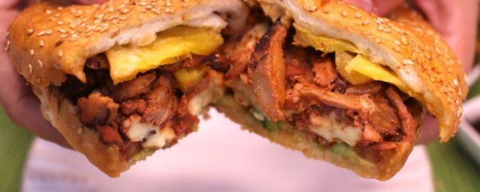 pan de 15 cm, frijoles, mayonesa, jitomate, aguacate, quesillo, BISTECK, CHORIZO Y PIÑA
