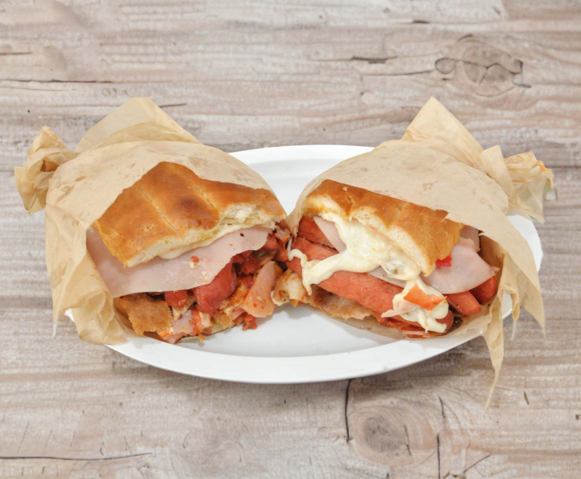 carne de res, jamon de pavo, quesillo, queso amarillo tipo americano, piña, preparadas con lechuga jitomate rajas caseras catsup mostaza y mayoneza