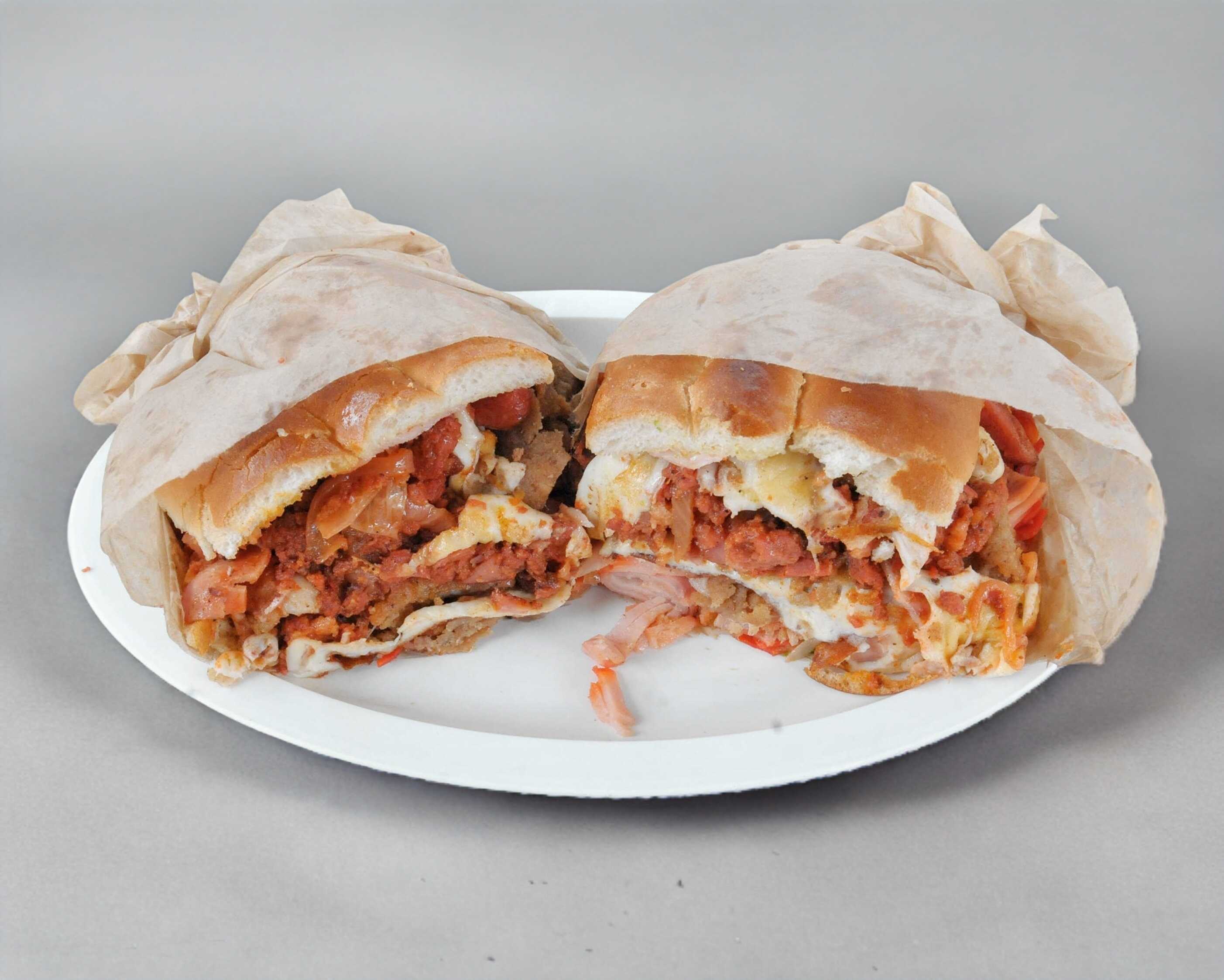 doble porciòn de: milaneza, pierna,salchicha,jamon,quesillo,queso amarillo, queso panela, chorizo y huevo revuelto.