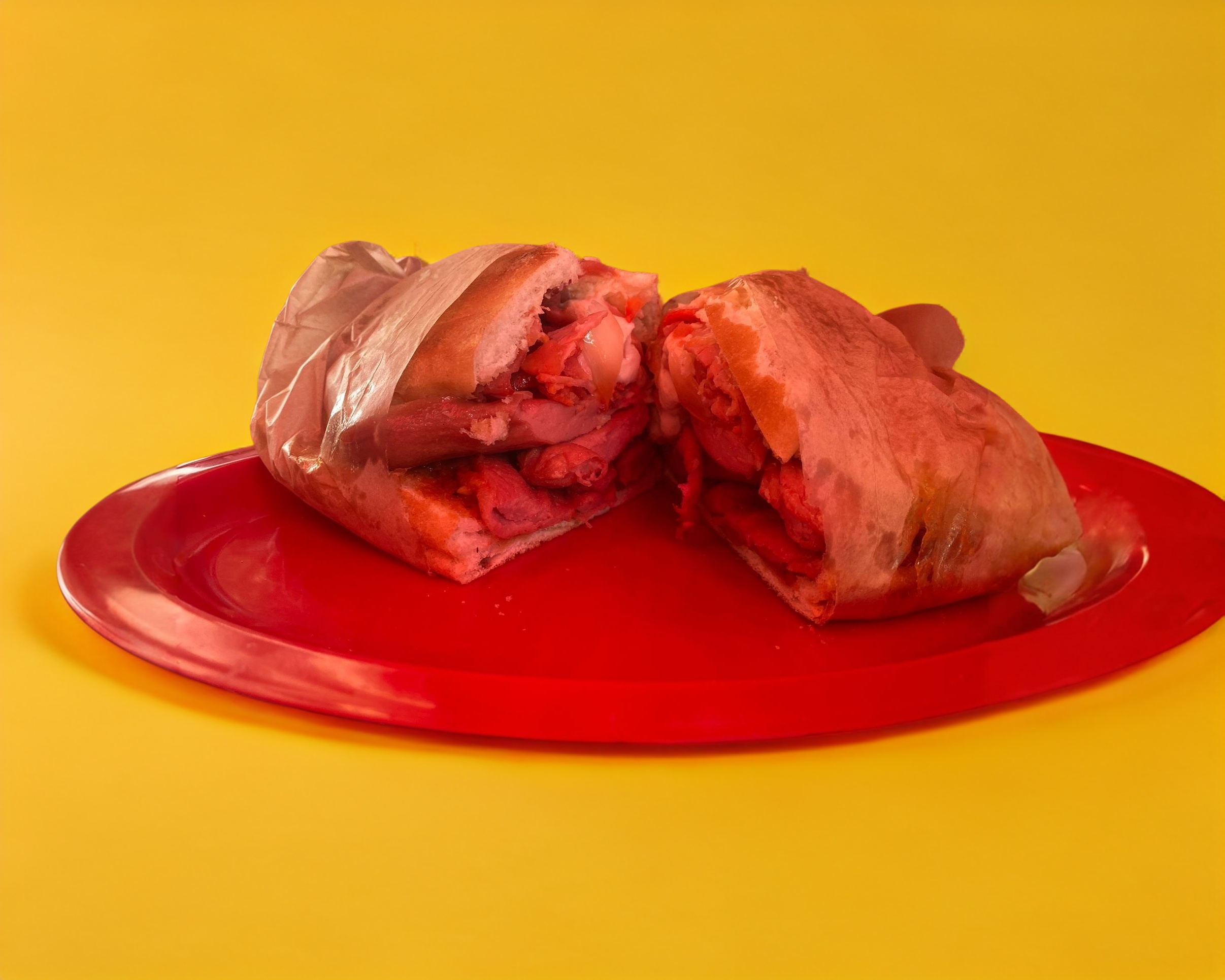 Salchicha, piña, quesillo, mayonesa, frijoles, aguacate y jitomate