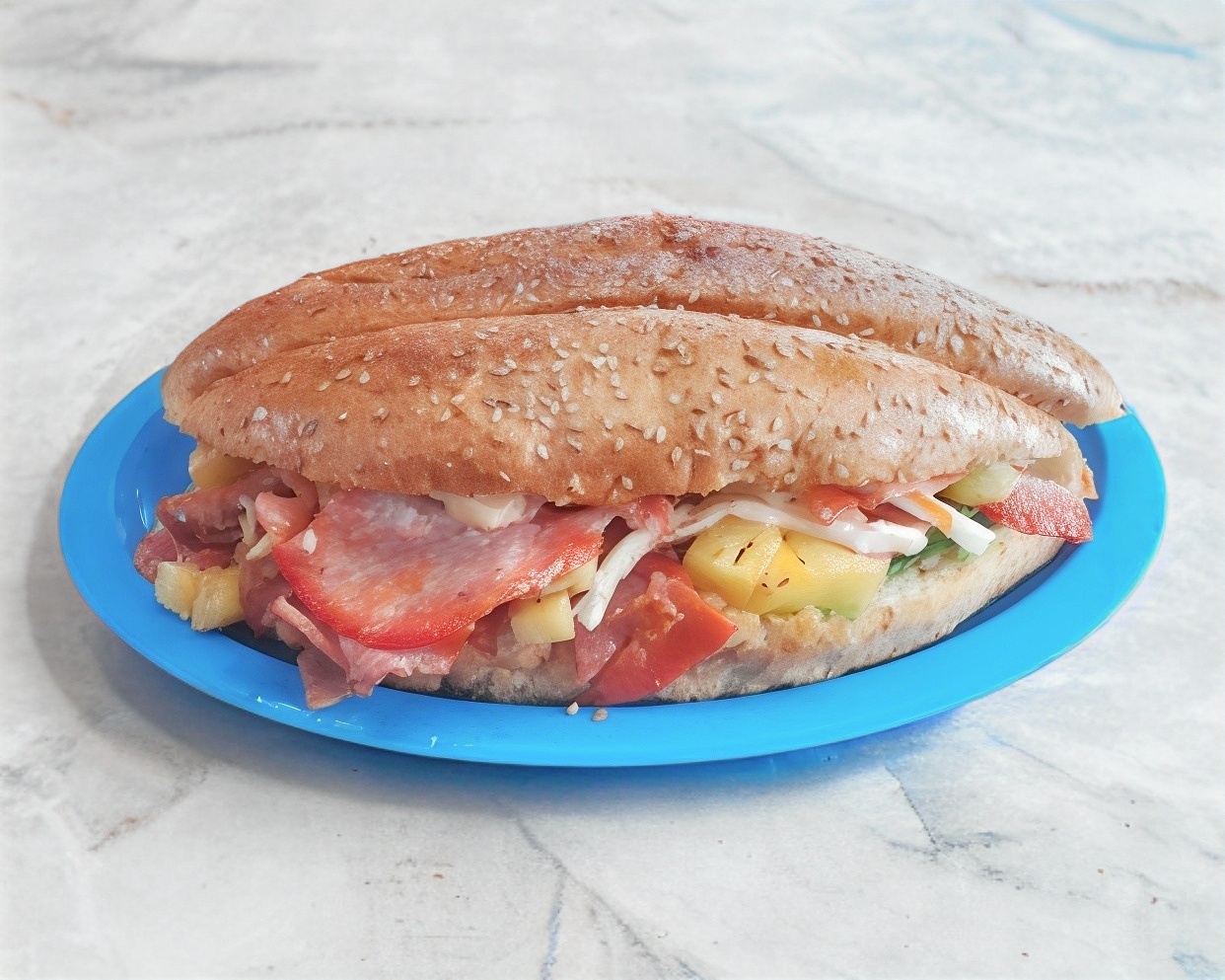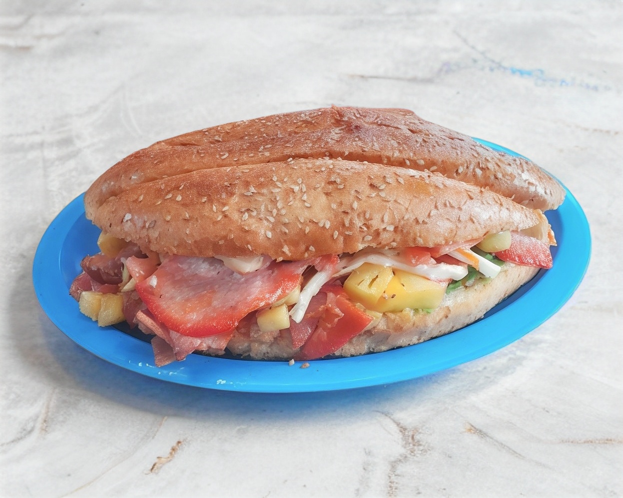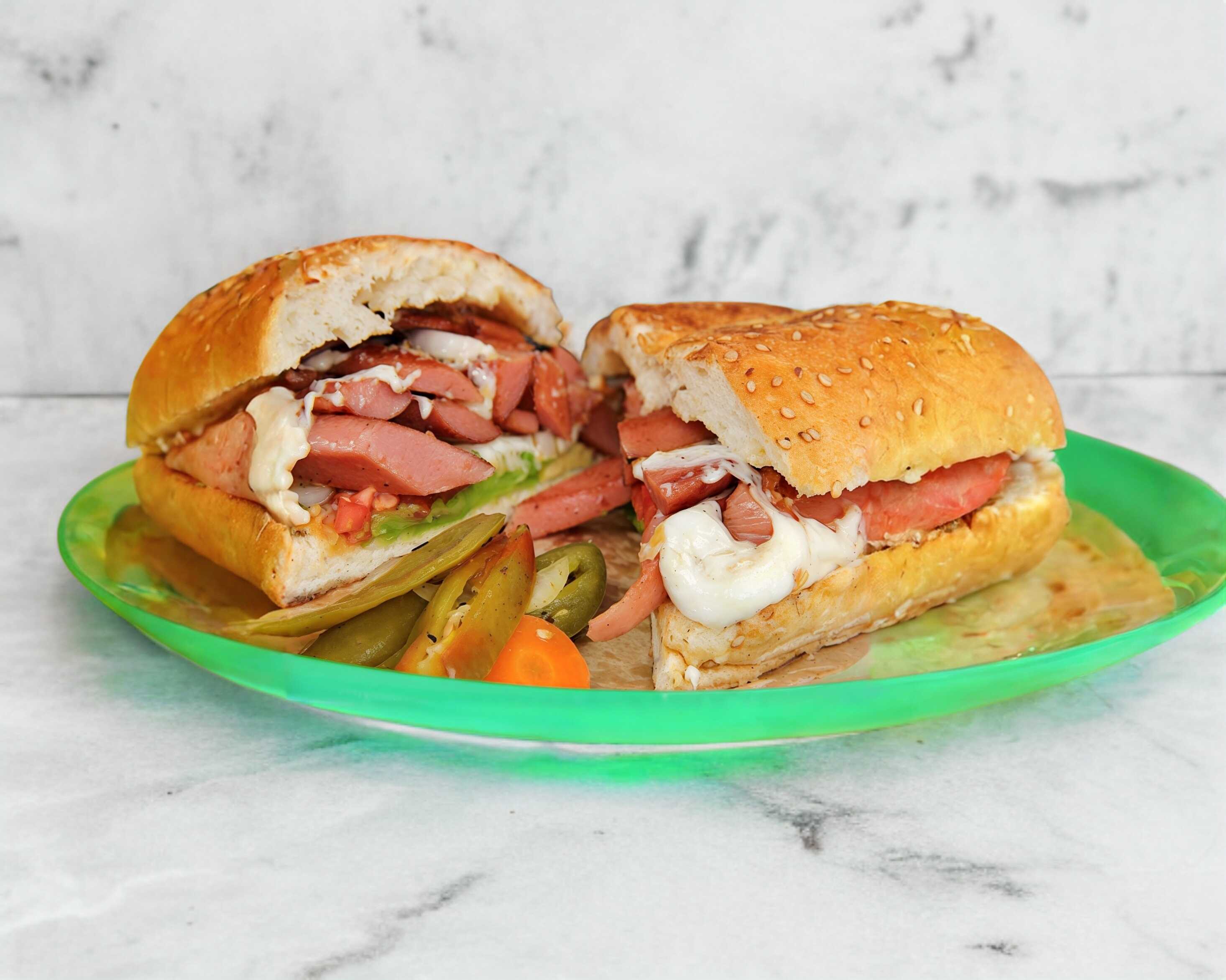 Jamón, queso amarillo y quesillo, aguacate, jitomate, cebolla, mayonesa, chipotle o rajas