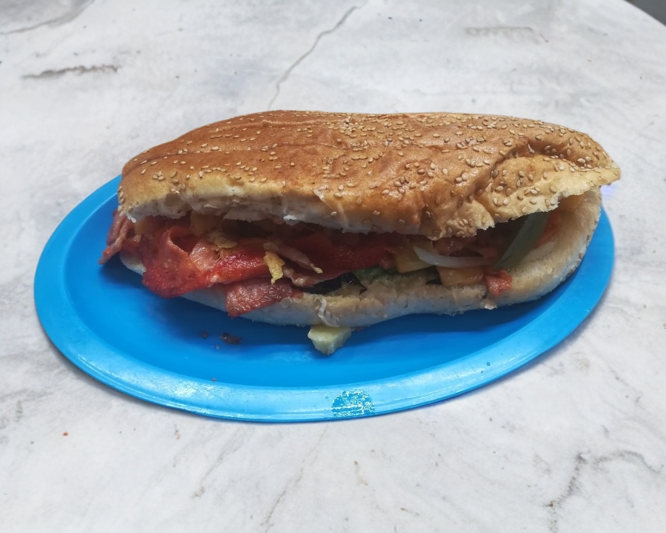 Bisteck, tocino, quesillo, aguacate, jitomate, cebolla, mayonesa, chipotle o rajas