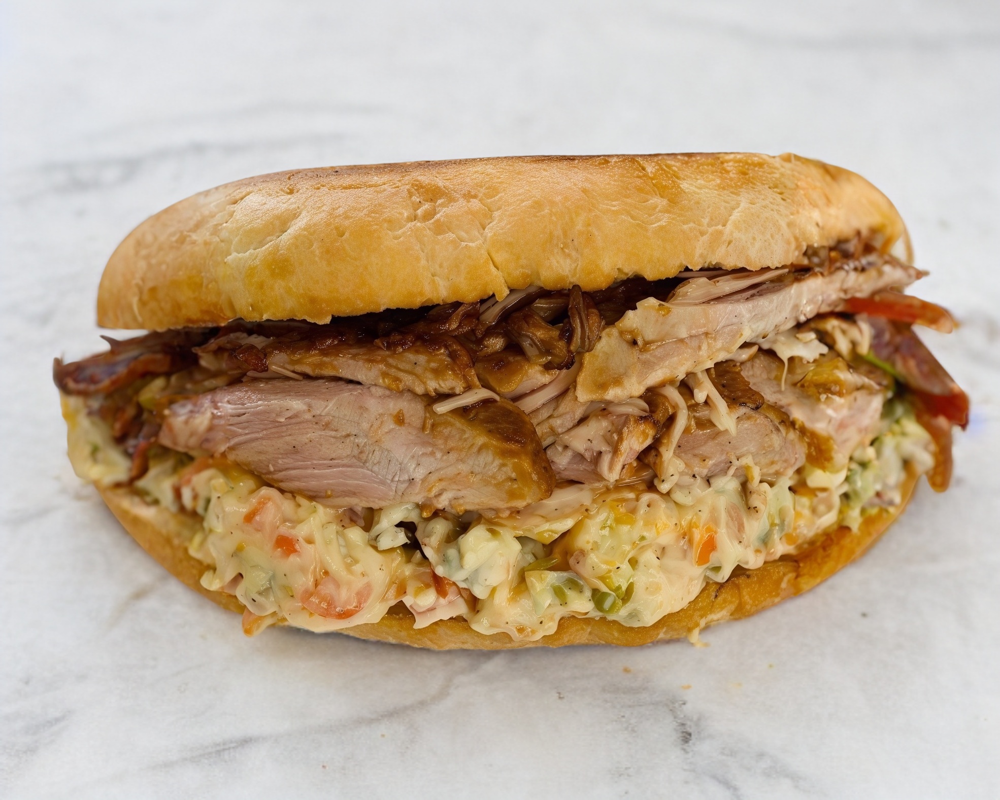 Pierna con quesillo, aguacate, jitomate, cebolla, mayonesa, chipotle o rajas