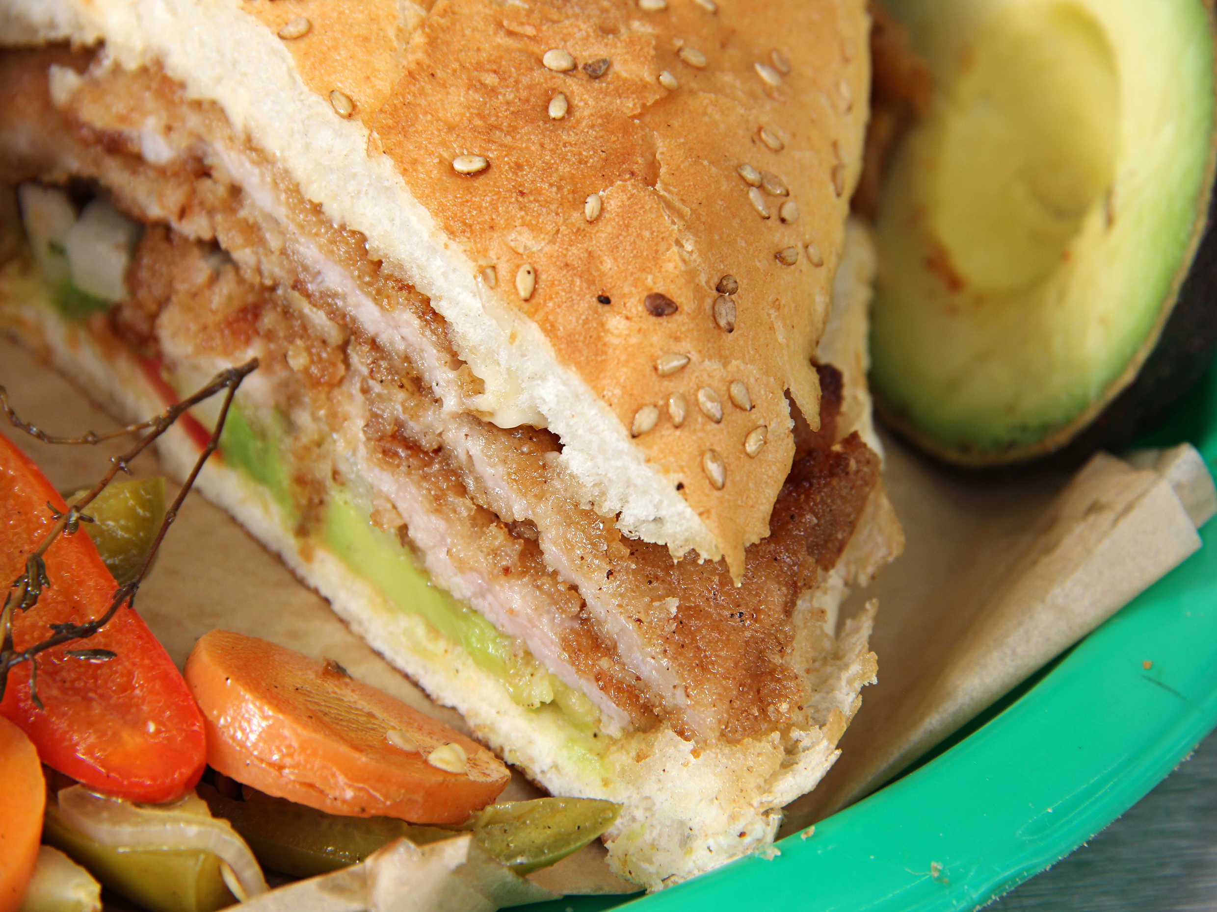 Pechuga de pollo enpanizada, quesillo, aguacate, jitomate, mayonesa, chipotle o rajas