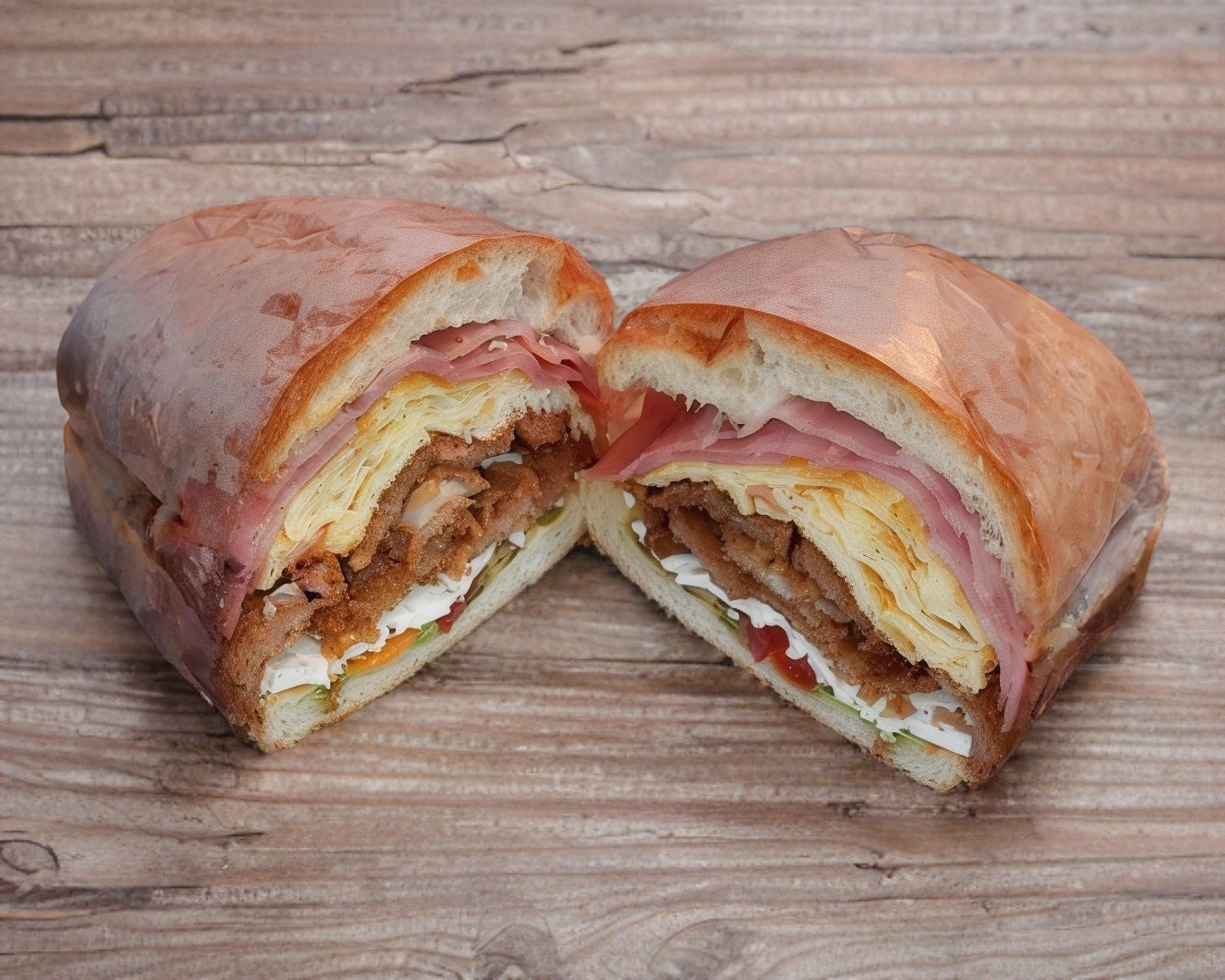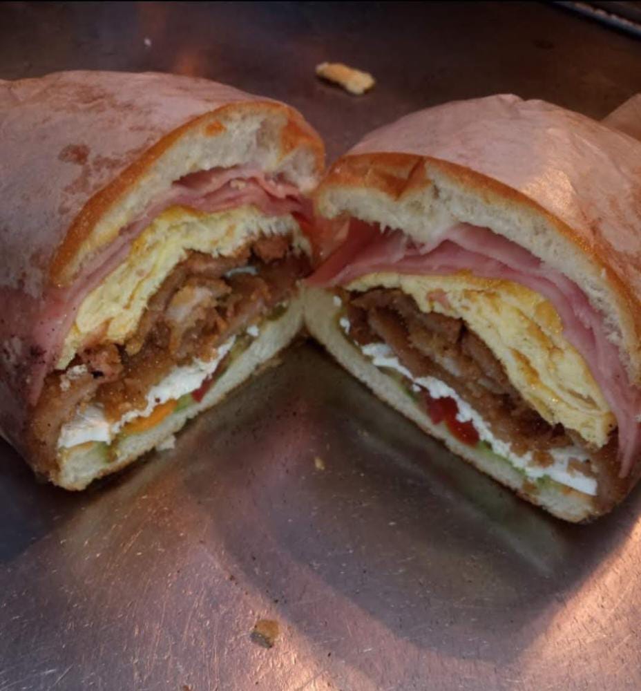 Pierna, huevo y quesillo. Acompañada de verdura, aguacate, tomate, cebolla, mayonesa, picante.