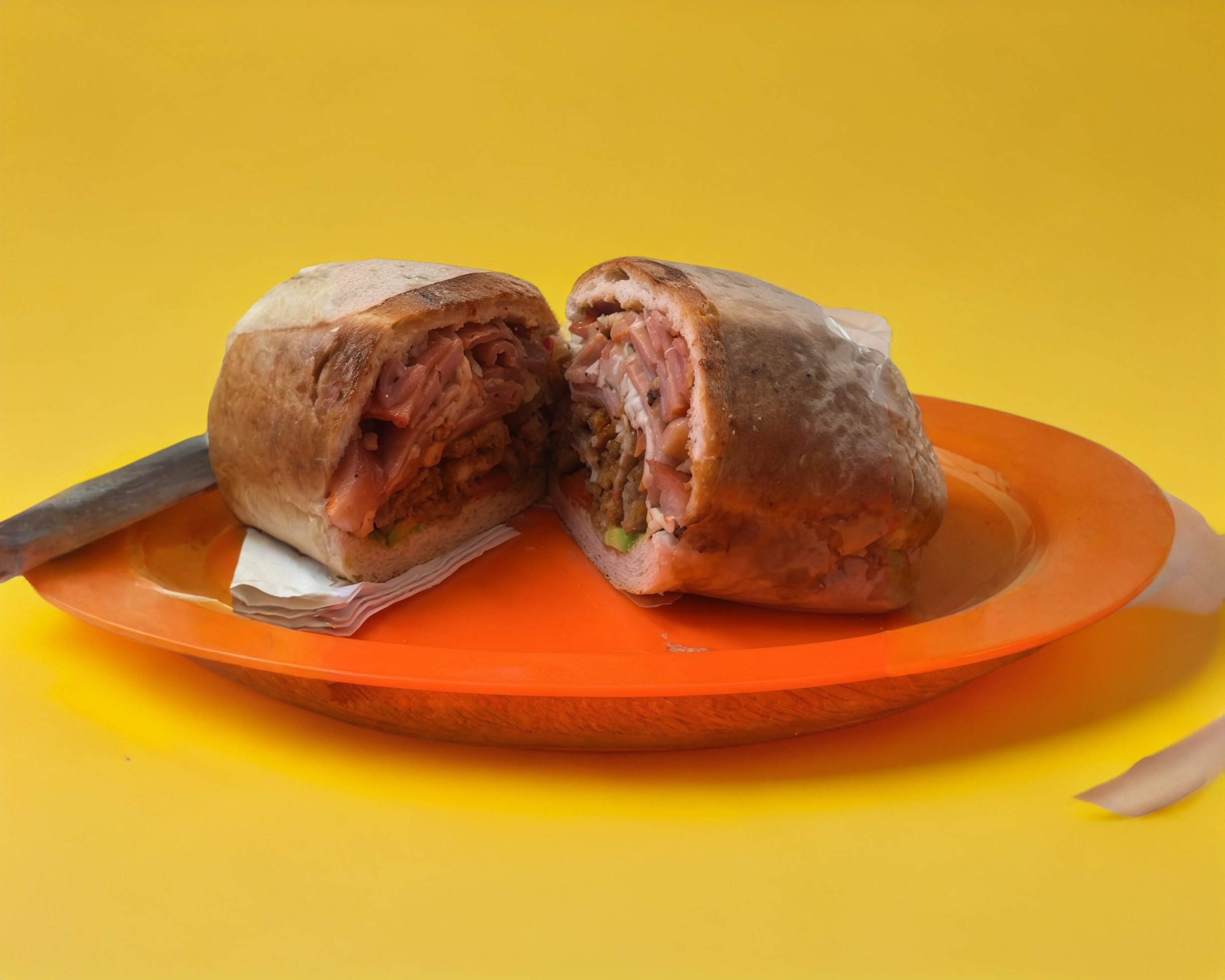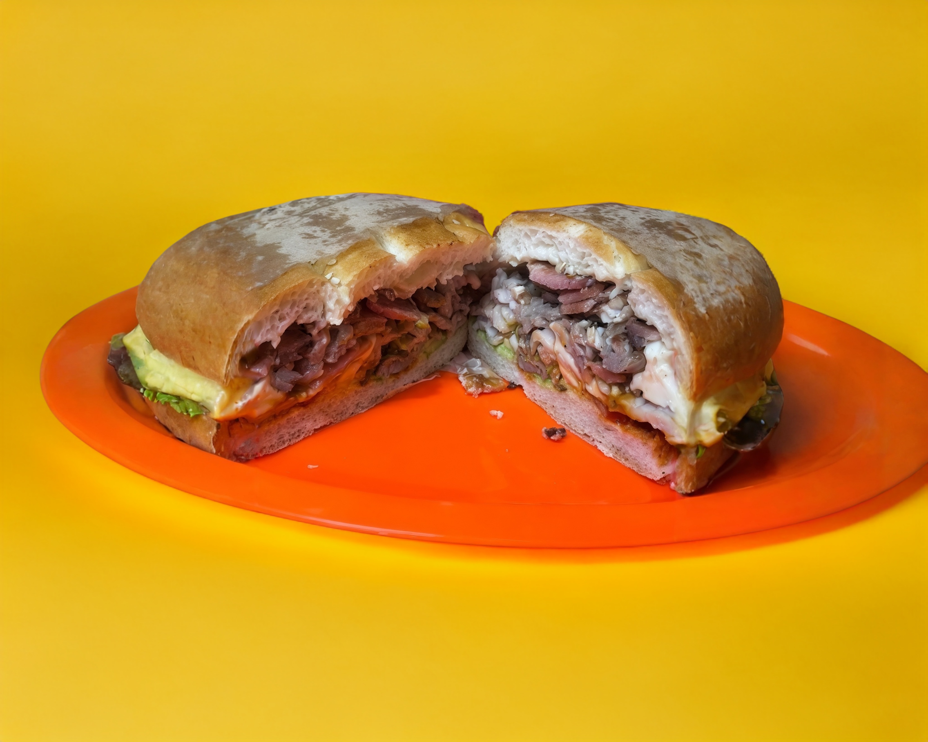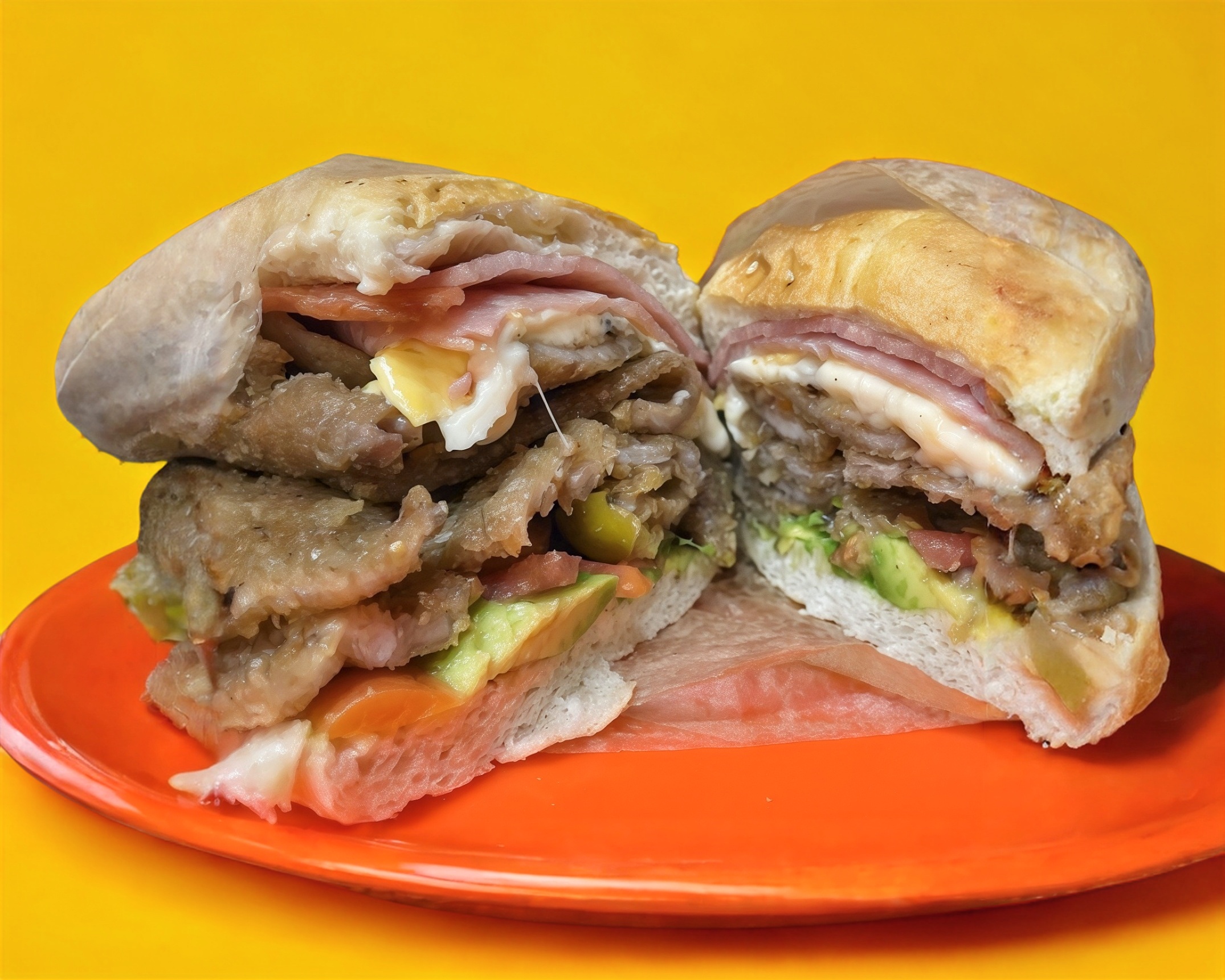 Aguacate, jitomate, mayonesa, picante, milanesa, chuleta, queso amarillo y queso panela.