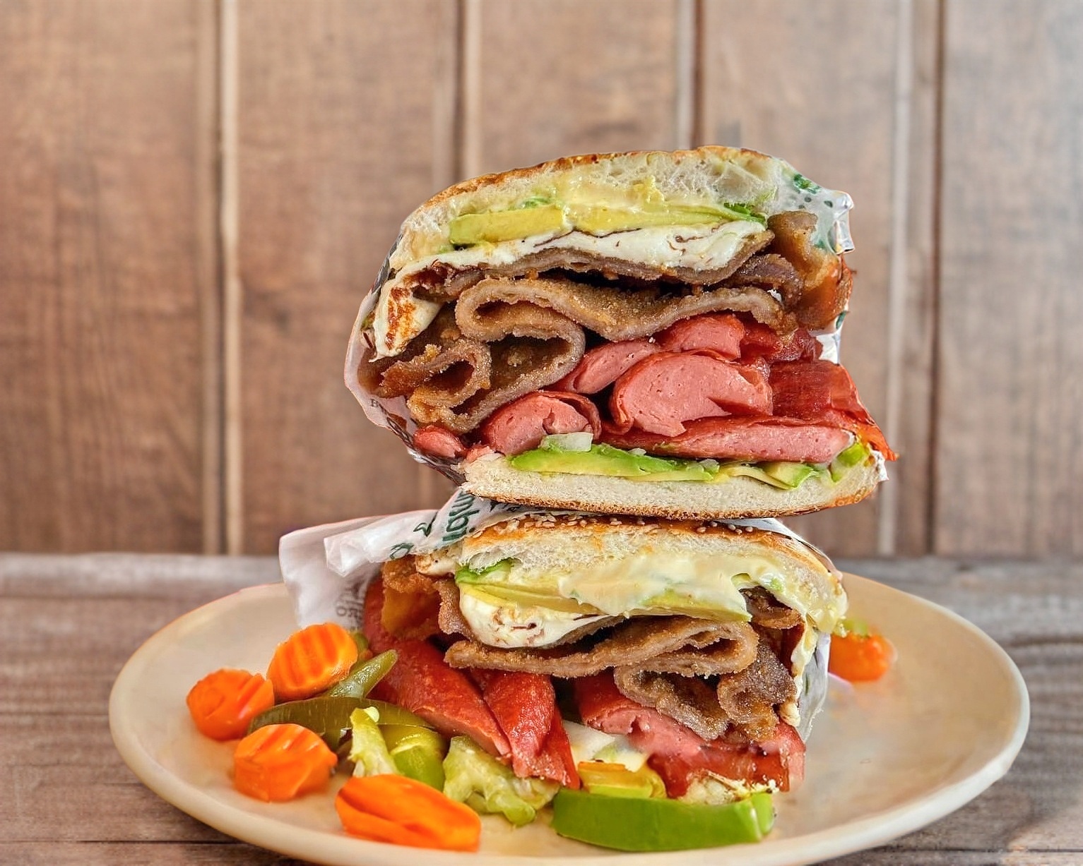 Torta con milanesa, pierna jugosa, piña dulce, quesillo fundido y tu elección entre rajas o crema de chipotle.