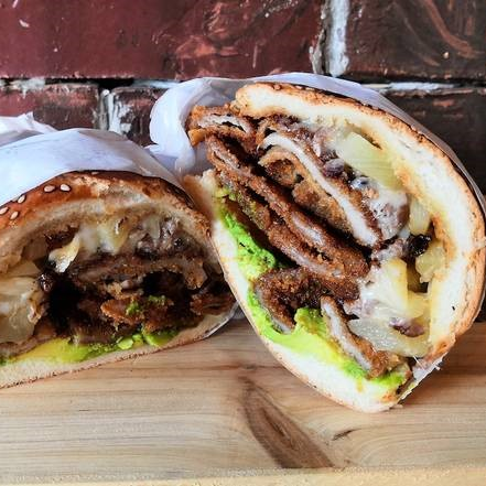 Milanesa, piña, quesillo, frijoles, mayonesa, aguacate, jitomate, cebolla, rajas con chipotle y lechuga.