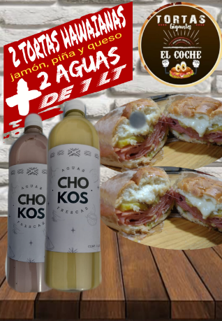 2 Tortas Hawaianas (jamón piña y queso) + 2 Aguas de litro
