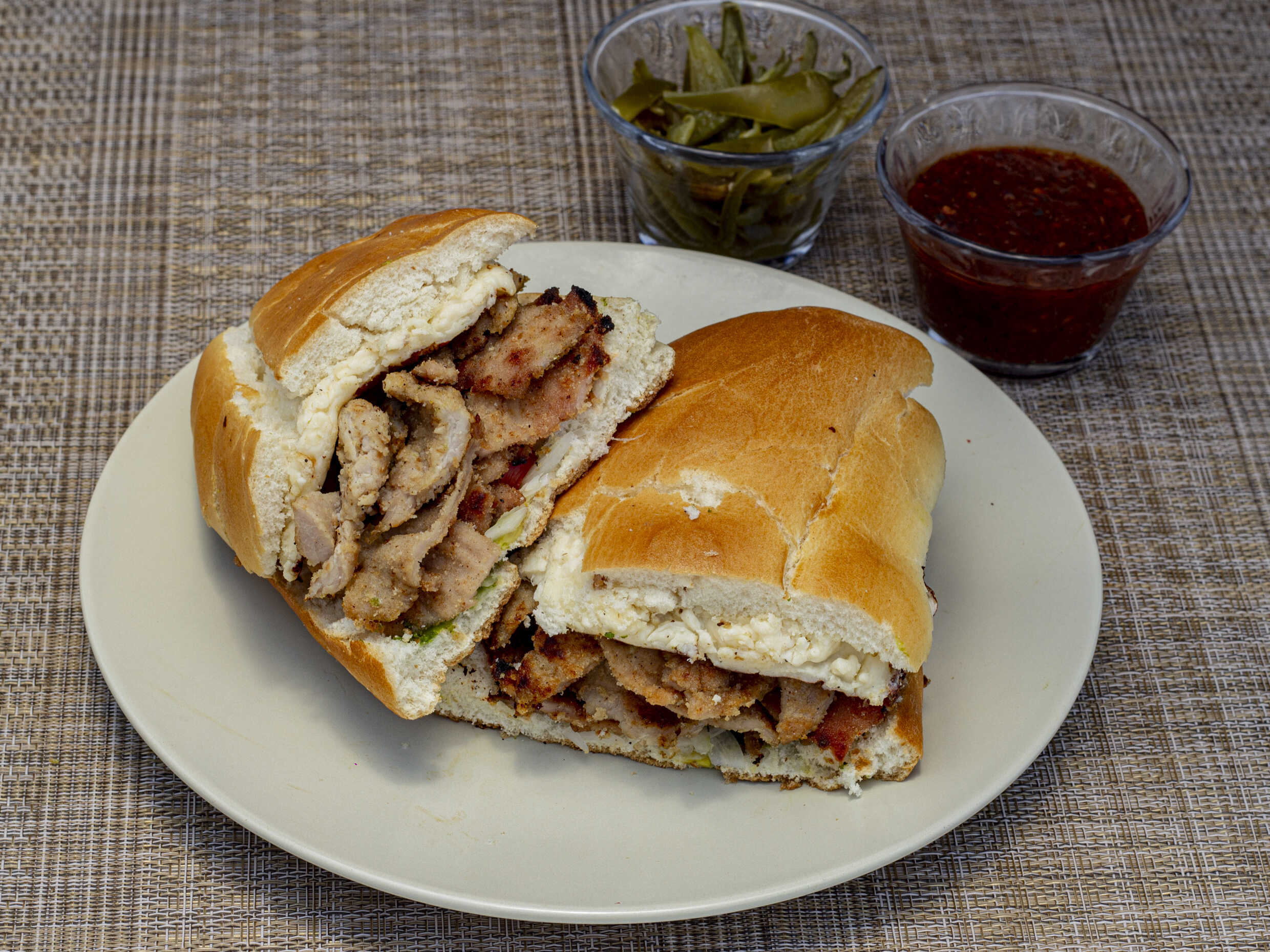 Lomo de cerdo BBQ, queso, mayonesa, aguacate, jitomate y cebolla
