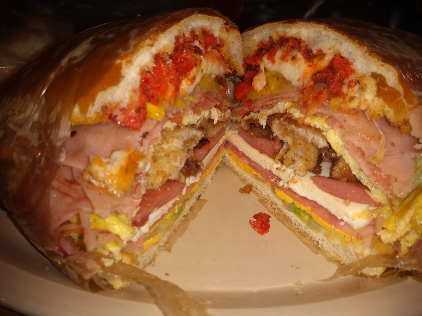 Jamón, queso amarillo, quesillo, mayonesa, aguacate, jitomate y cebolla