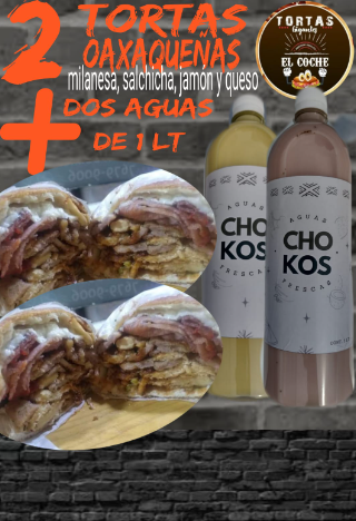 2 Tortas Oaxaqueñas (Milanesa, salchicha, jamón y quesito) + 2 Aguas de litro