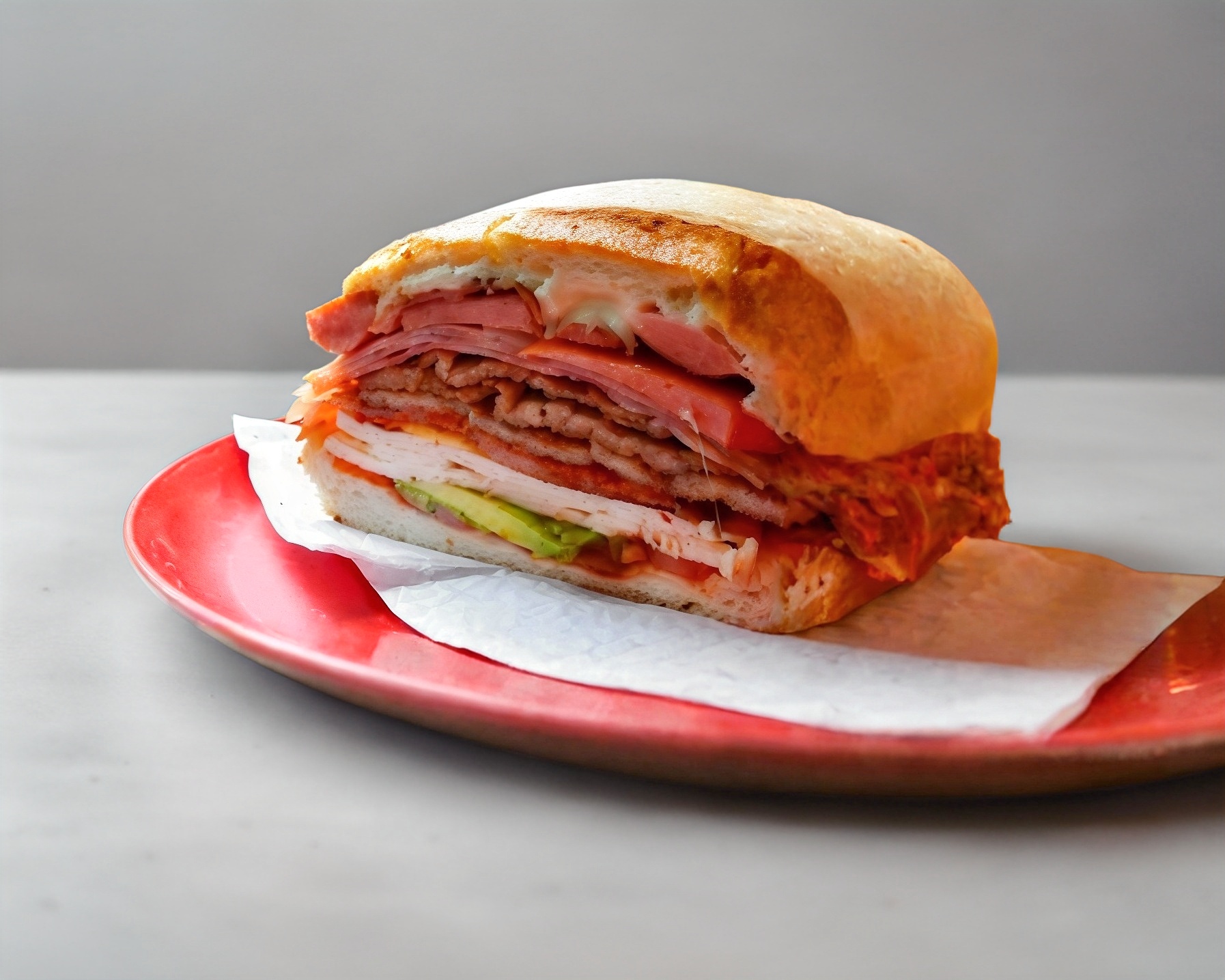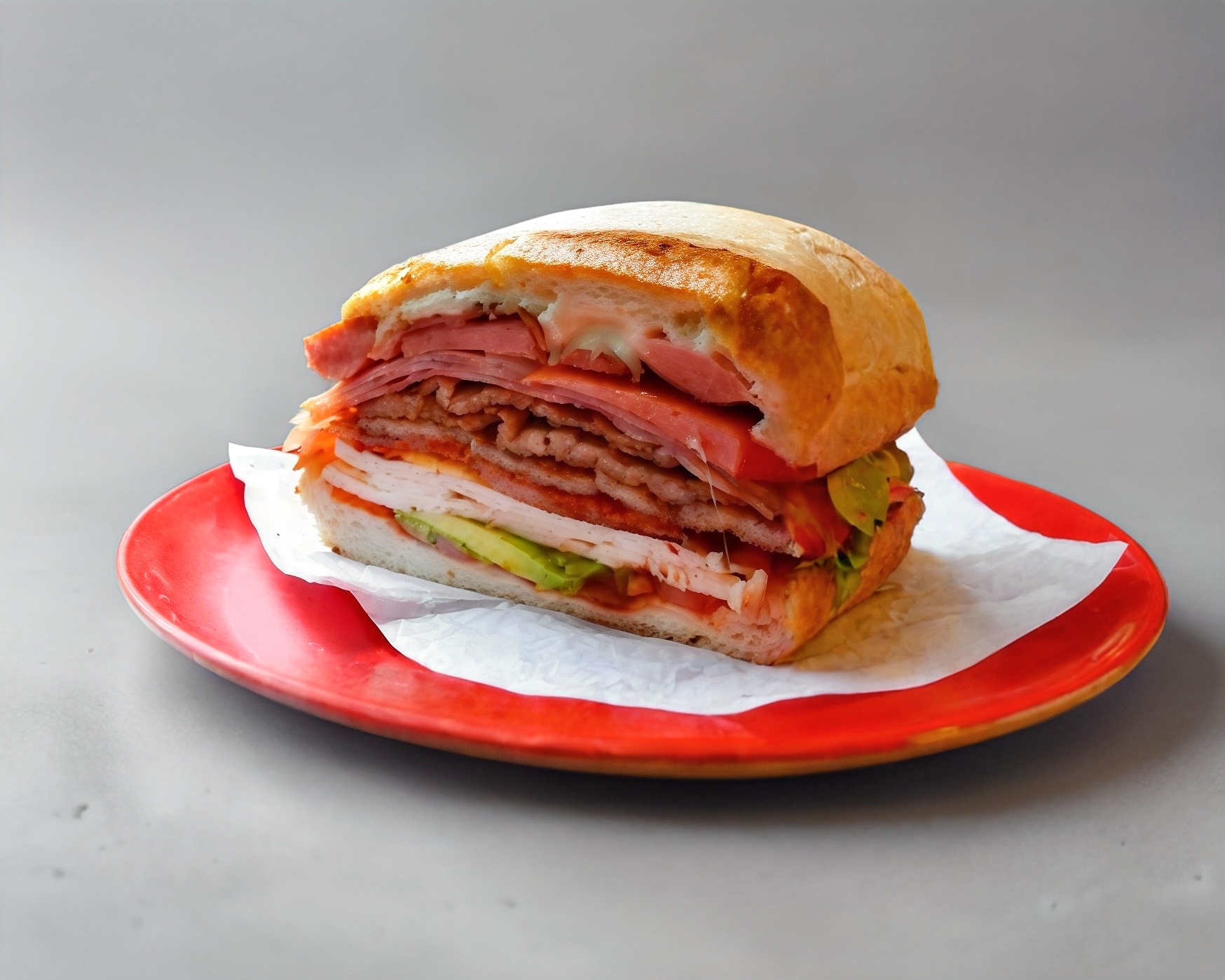 Pan telera tamaño doble, relleno de carne al pastor con queso gratinado tipo oaxaca, jitomate, cebolla y aguacate.