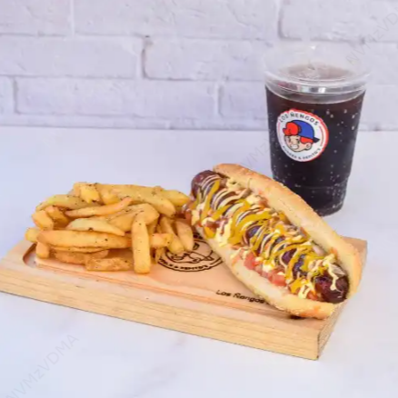 Pan, salchicha de res 120 g, cebolla, tomate y salsas base.