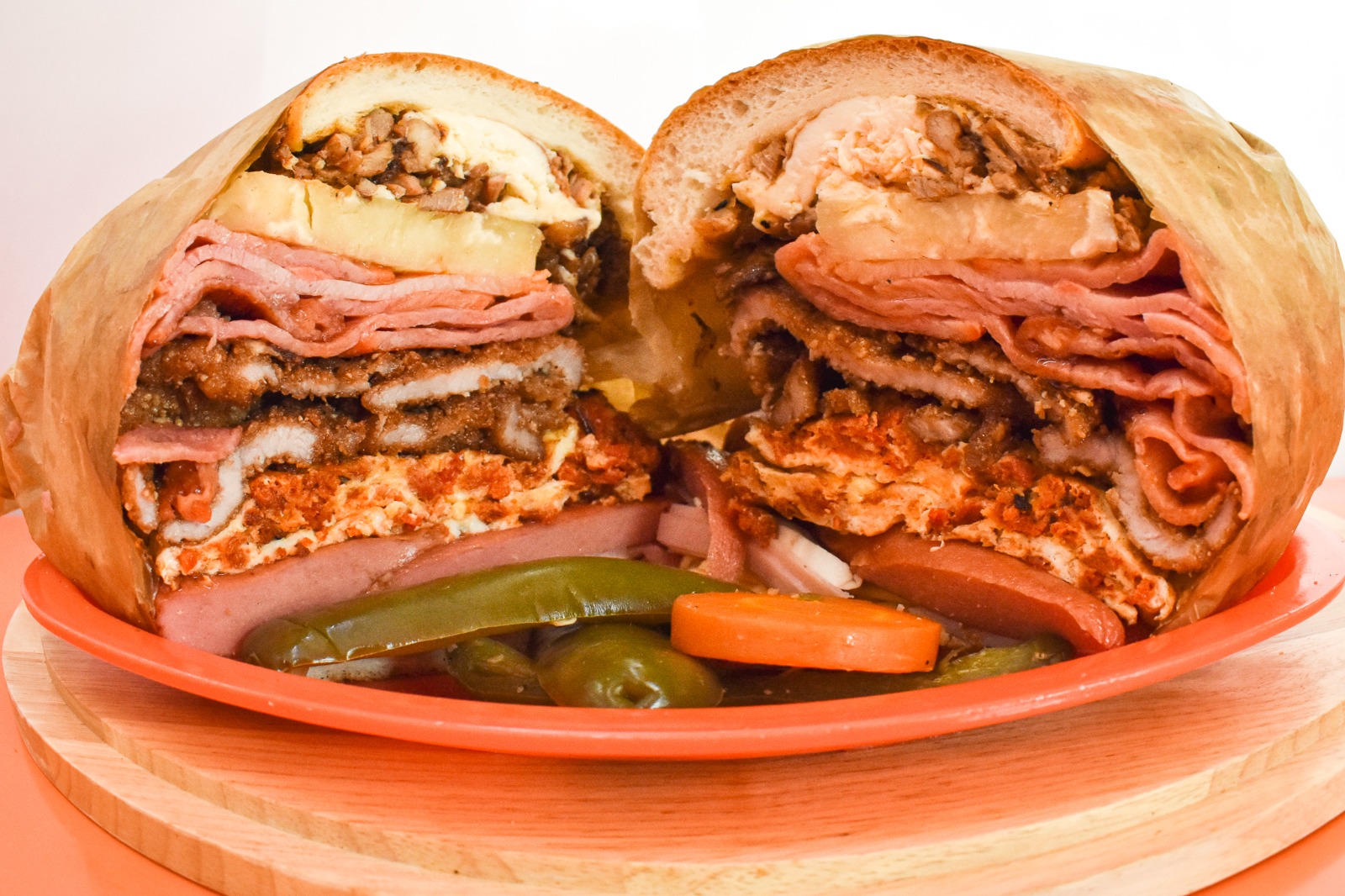 Torta de pastor, milanesa, pierna, quesillo, jamón, queso blanco, queso amarillo, queso de puerco, salchicha, chorizo, huevo, piña, jitomate, cebolla, aguacate y mayonesa.