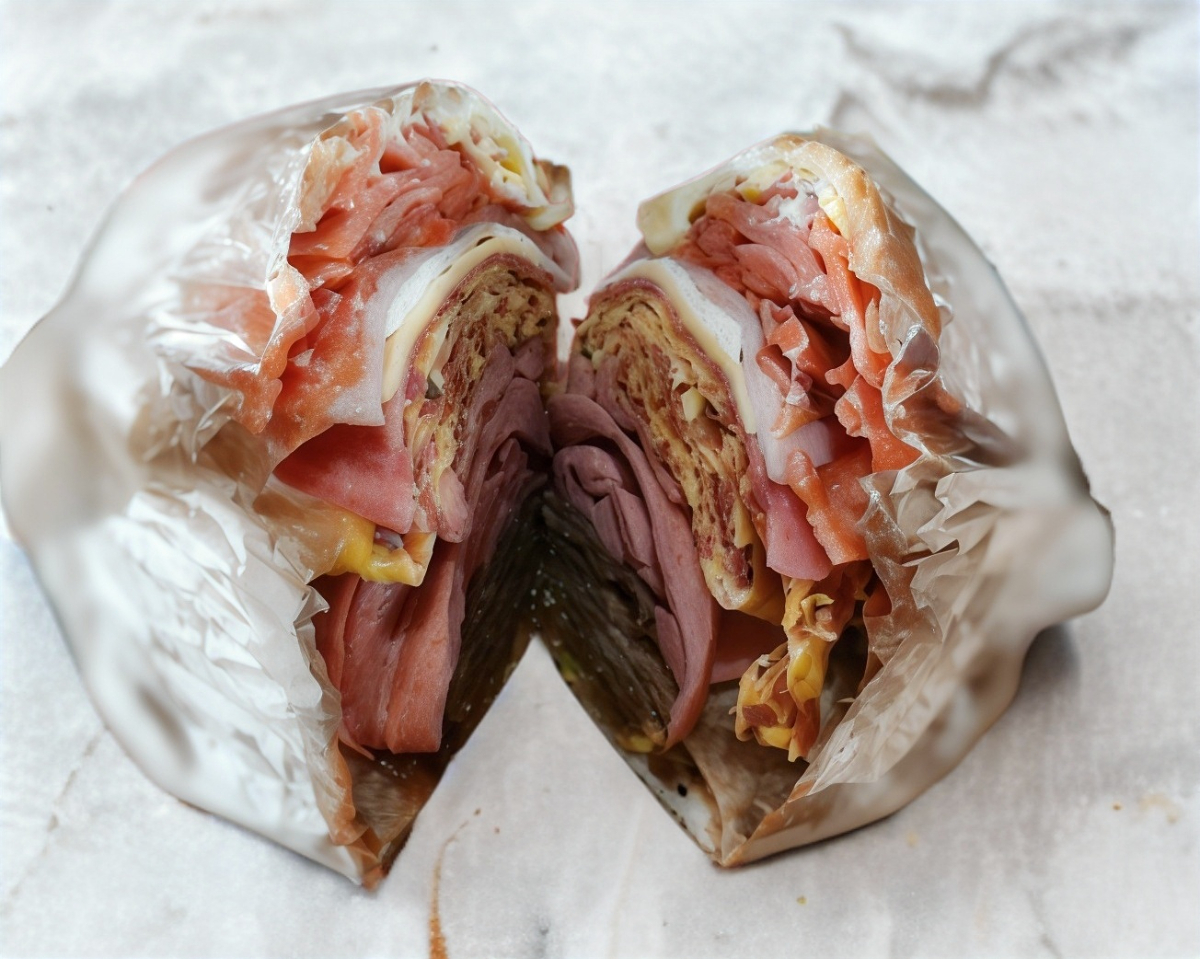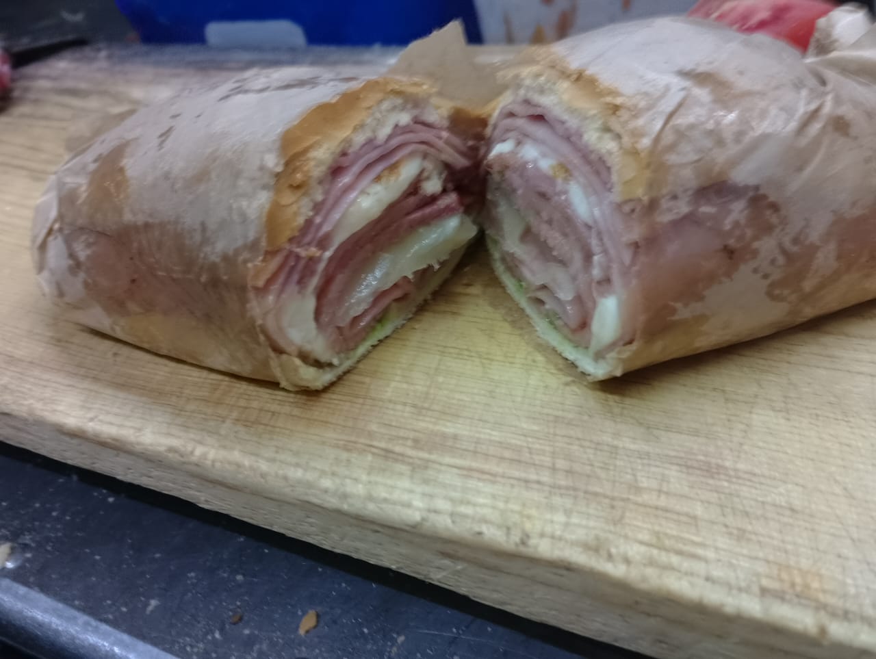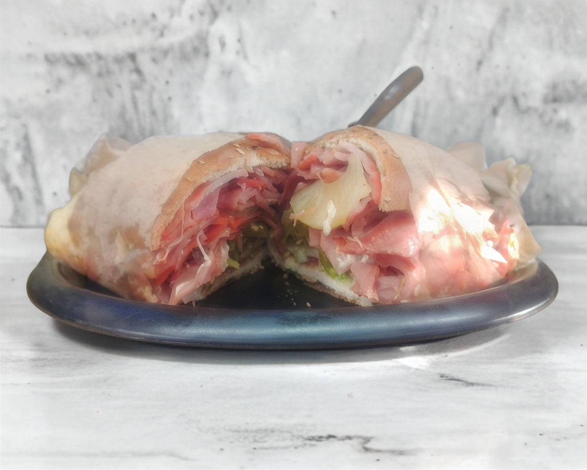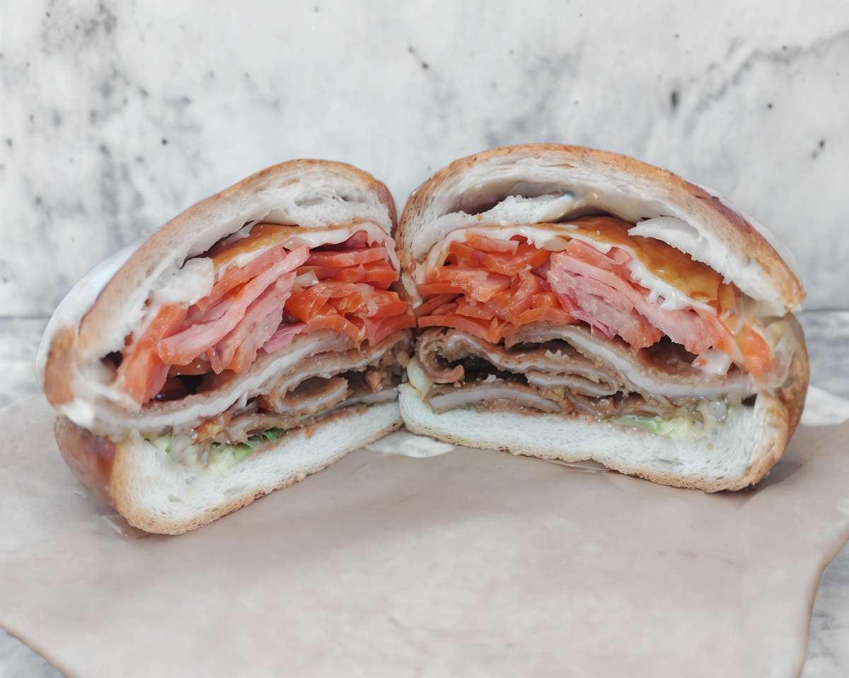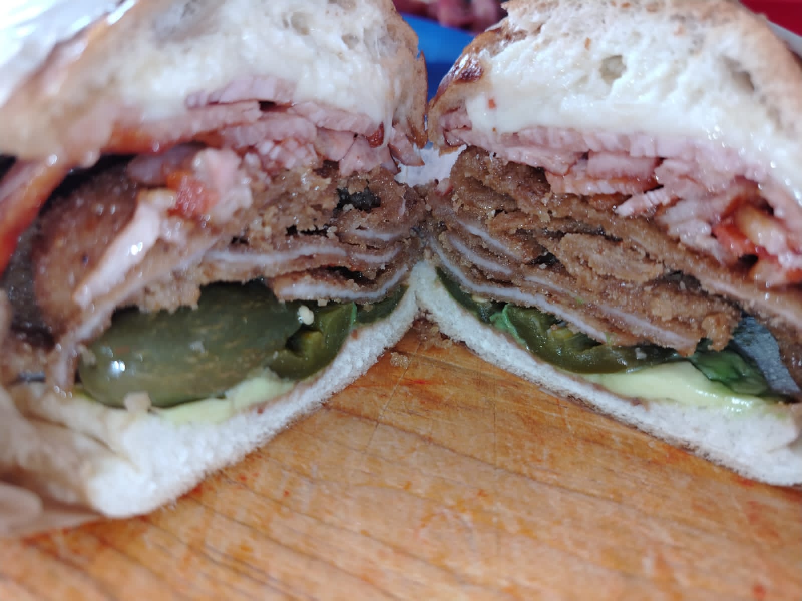 Telera rellena de milanesa, pierna y queso oaxaca.