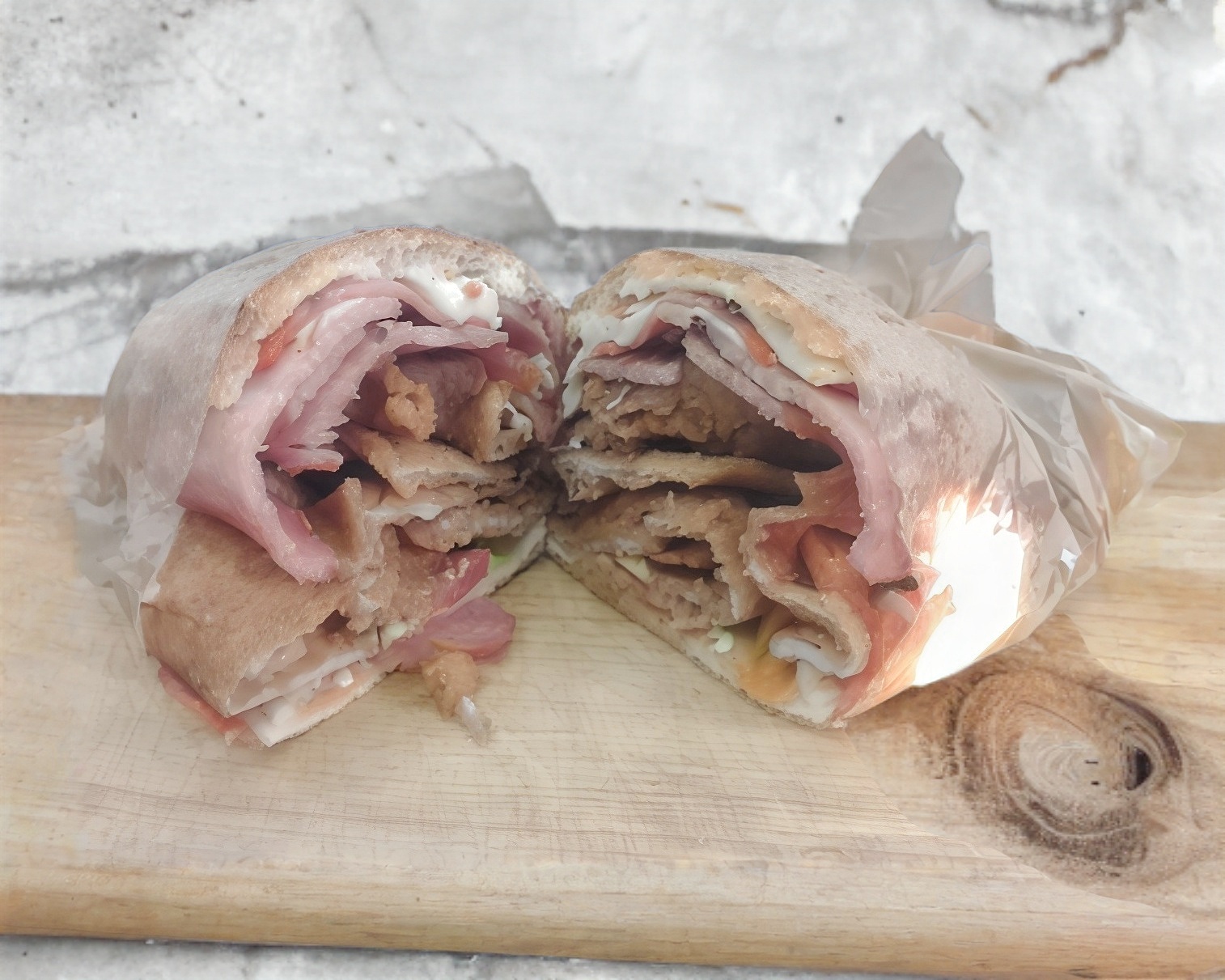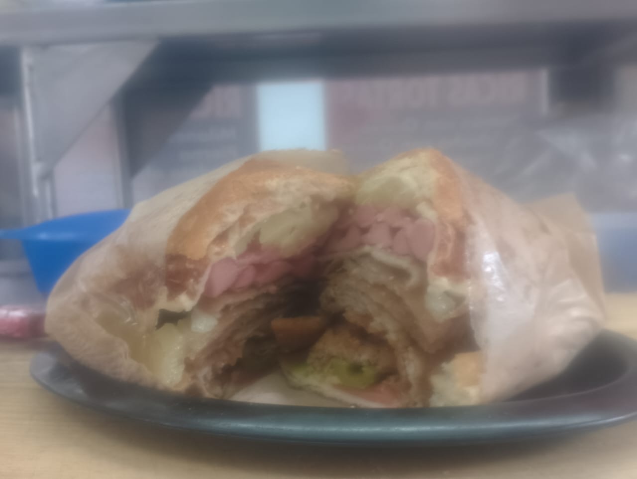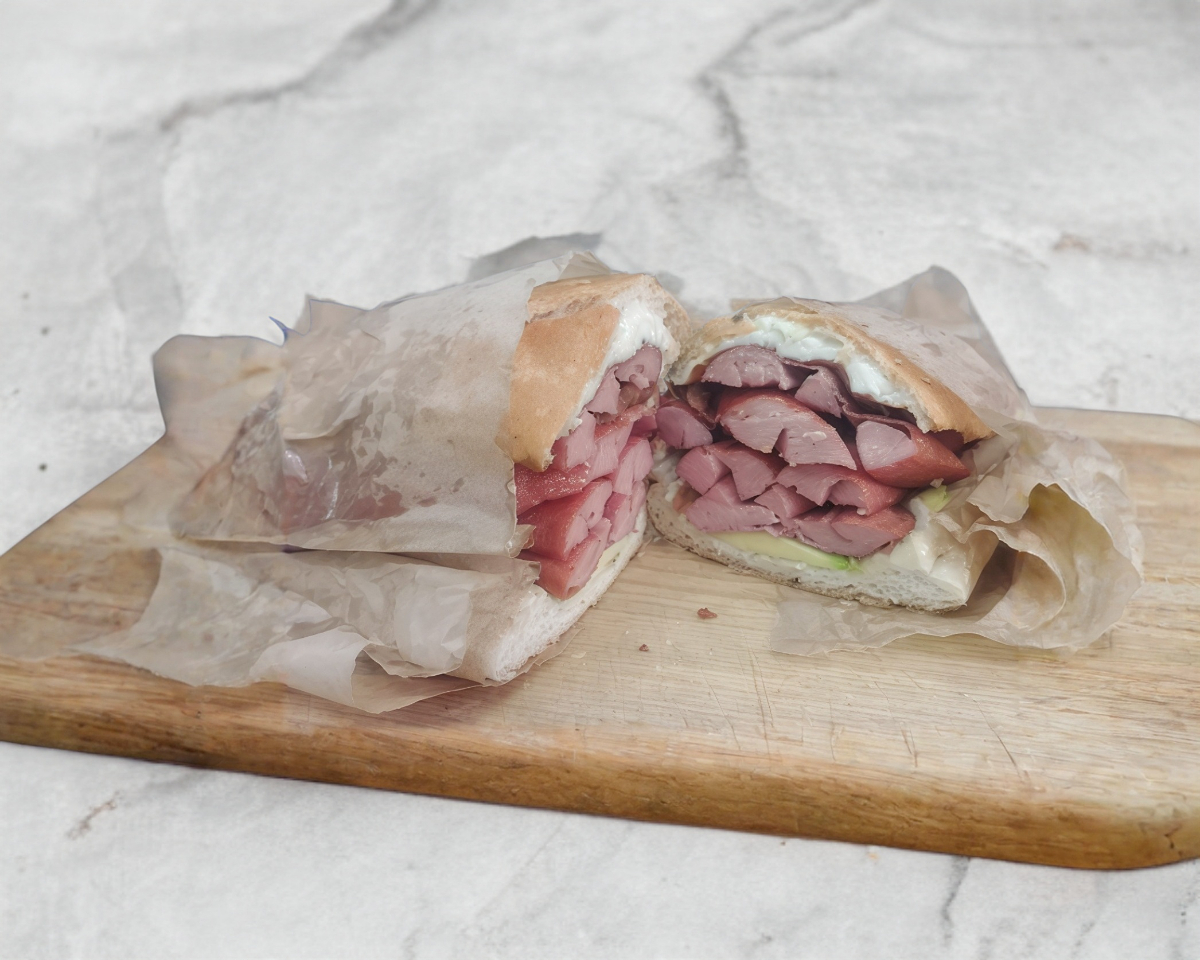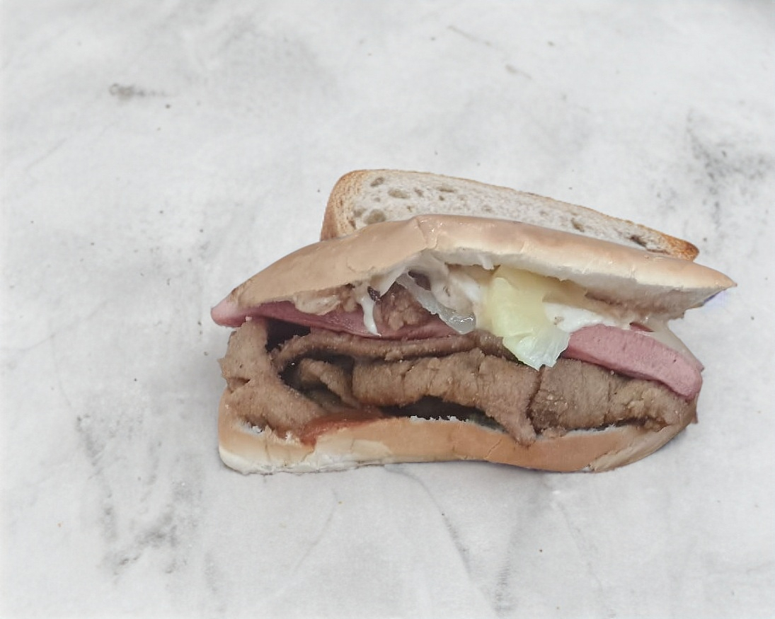 Telera rellena de milanesa, pierna, salchicha y quesillo.