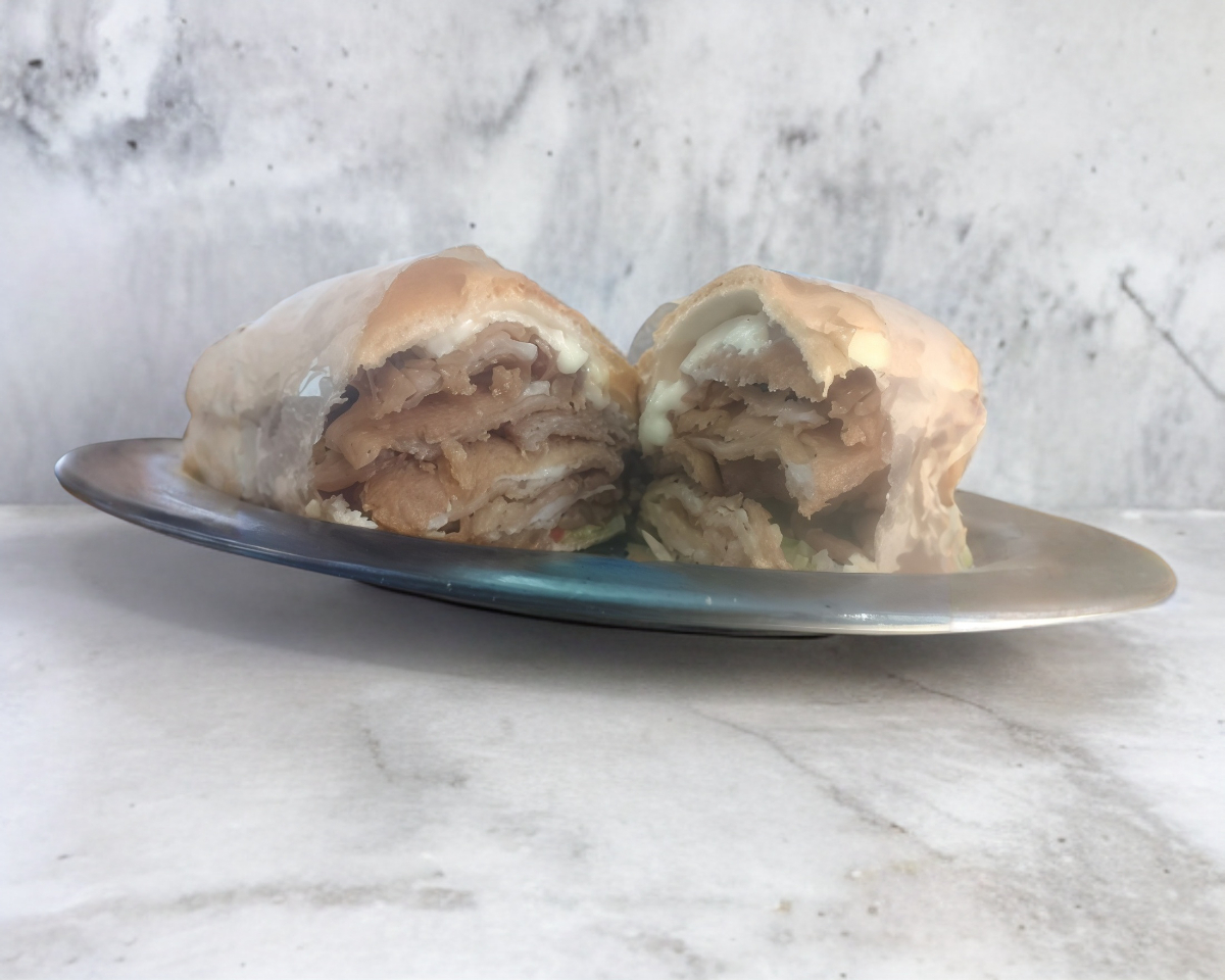 Telera rellena de milanesa, pierna, chuleta y quesillo.