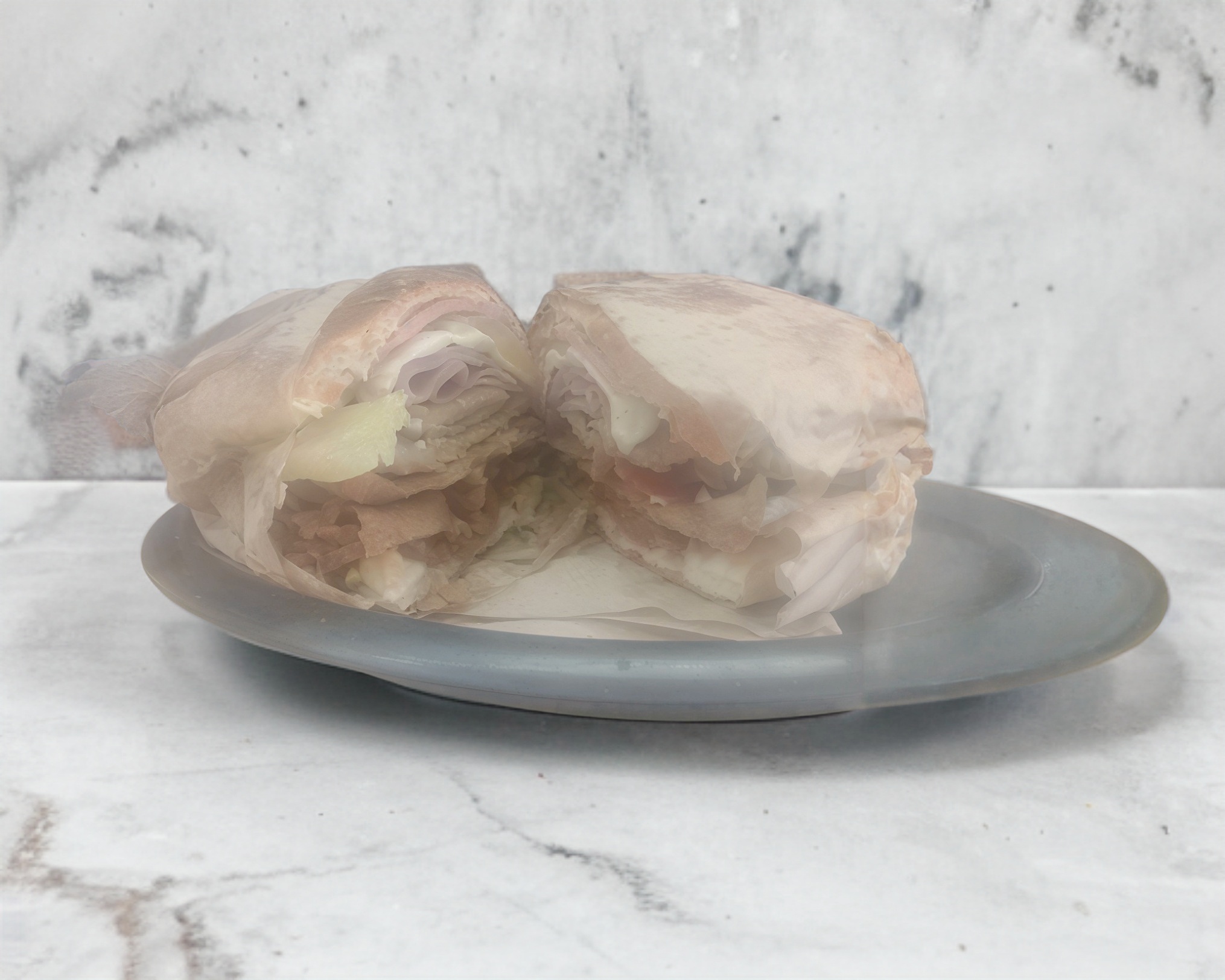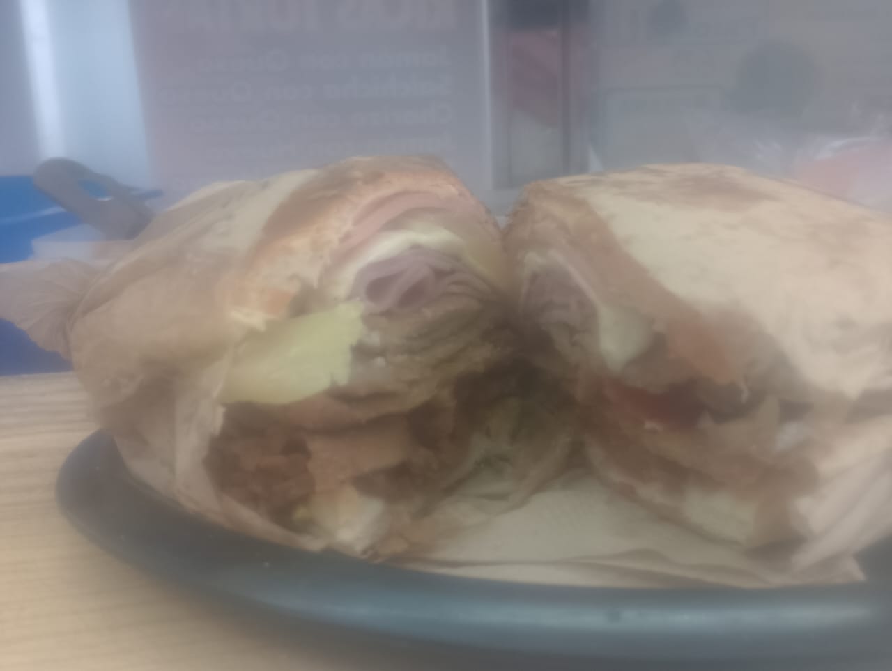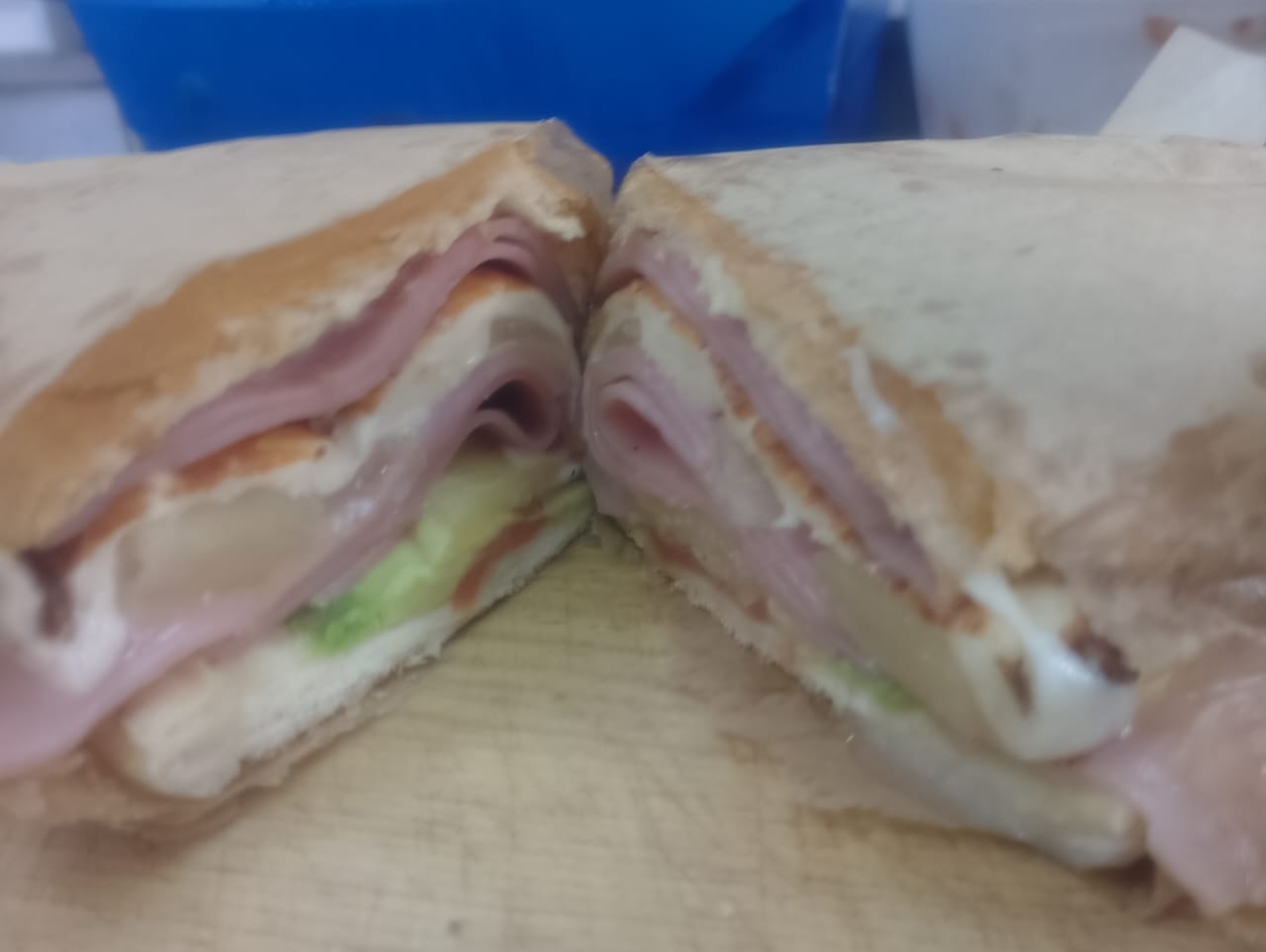 Telera rellena de jamón, queso amarillo y queso oaxaca.