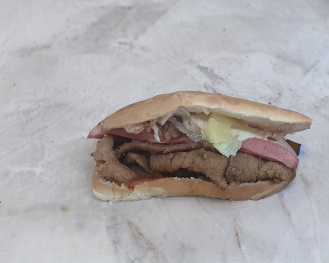 Telera rellena de milanesa, salchicha, piña y quesillo.