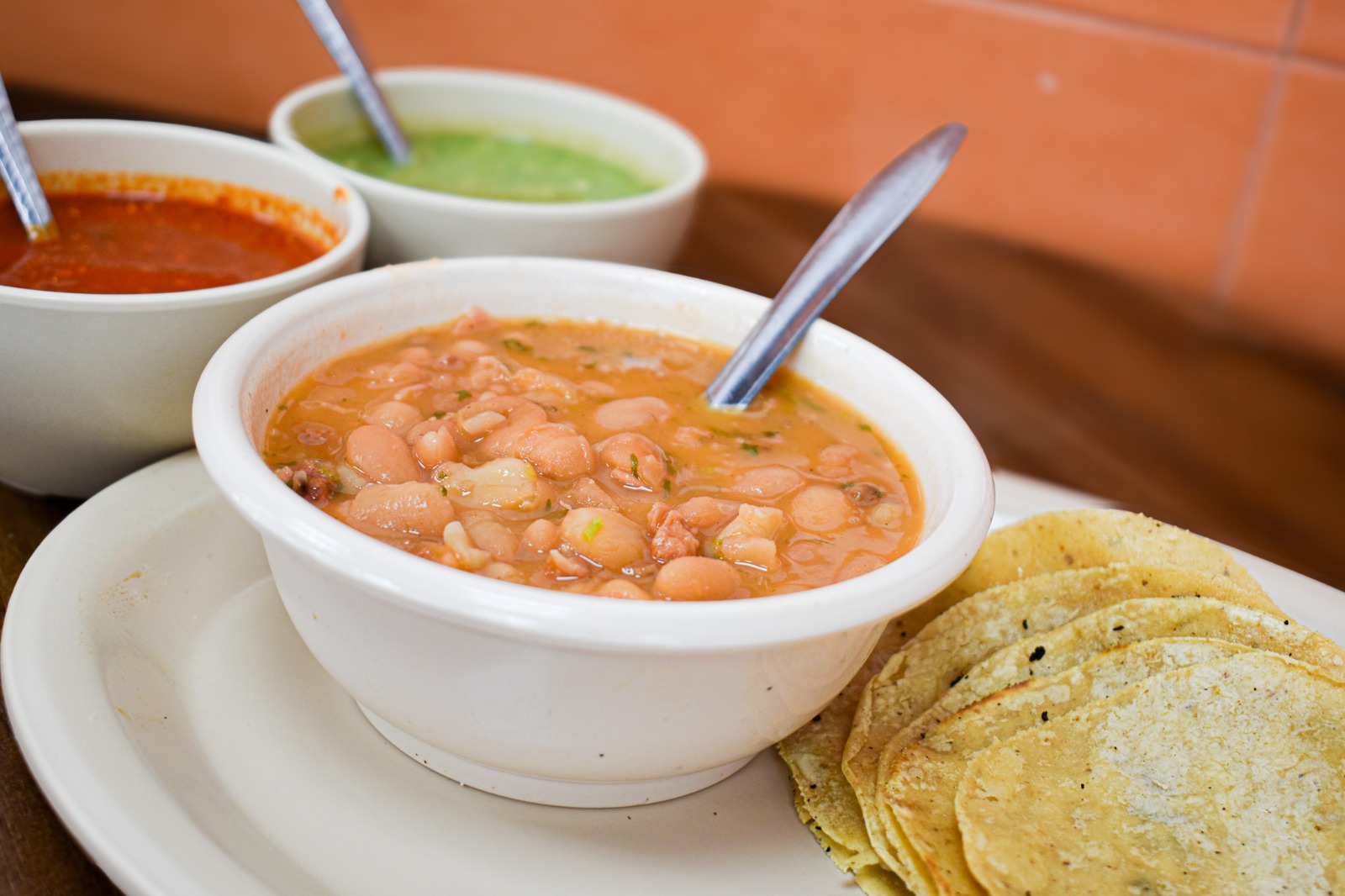 Frijoles cocinados con tocino, chorizo, salchicha, chile y cebolla.