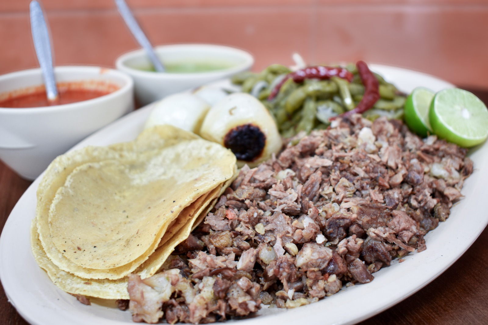 Orden de pastor acompañada de nopales y cebollitas cambray.