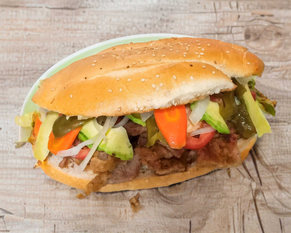 Bistec de puerco a la Plancha + Aguacate, Jitomate, Cebolla, Mayonesa y Picante.
