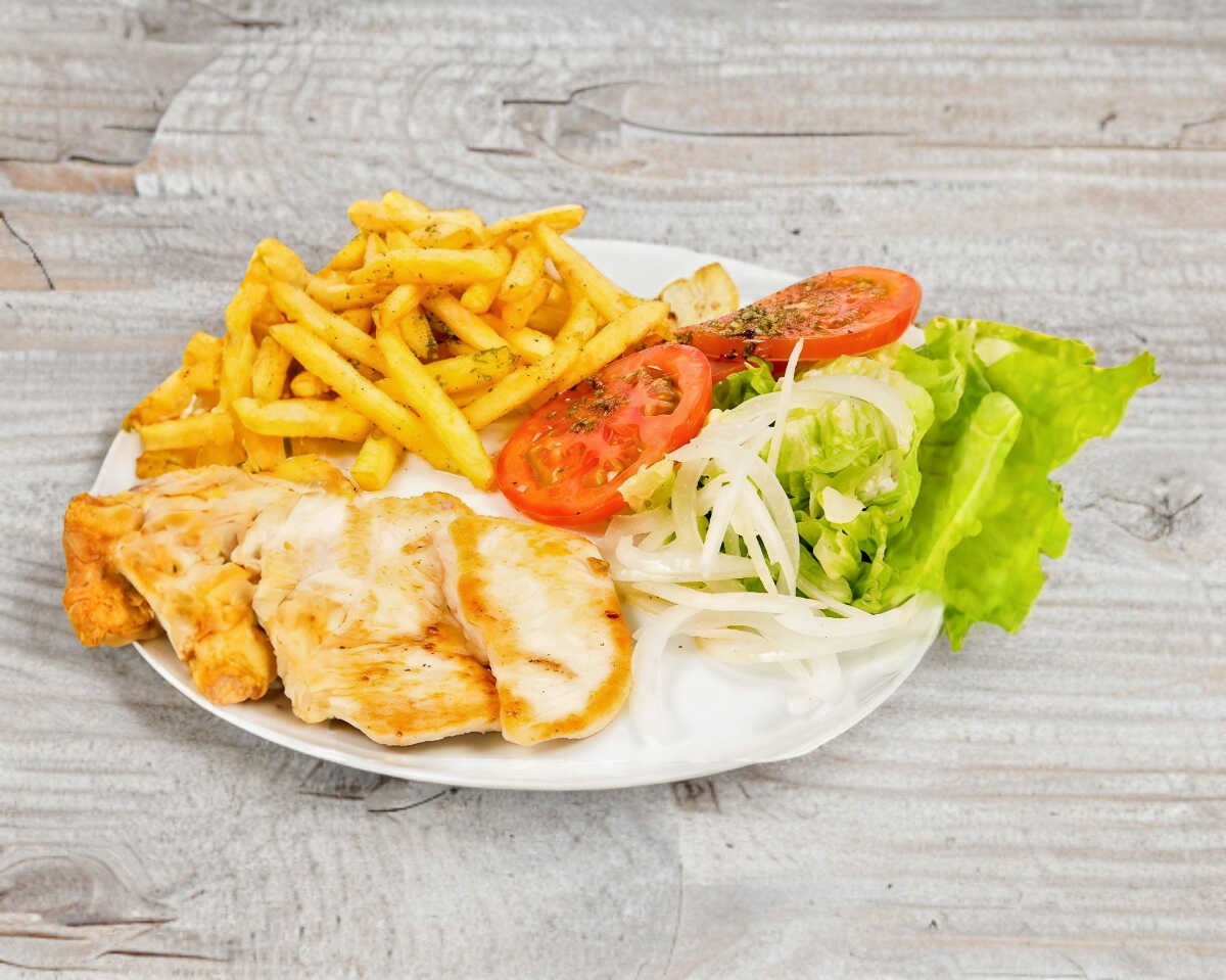 Exquisita!! Pechuga Asada con Deliciosa Ensalada de Lechuga, Jitomate y Aguacate + Papas fritas y Acompañada de Salsa Verde o Roja + Tortillas de Maiz.