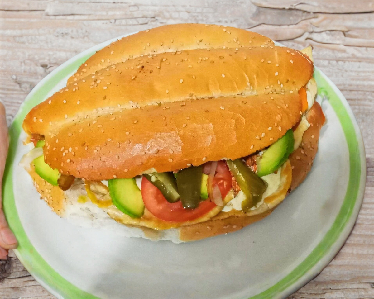 Exquisita!! Milanesa de Puerco + Aguacate, Jitomate, Cebolla, Mayonesa y Picante.