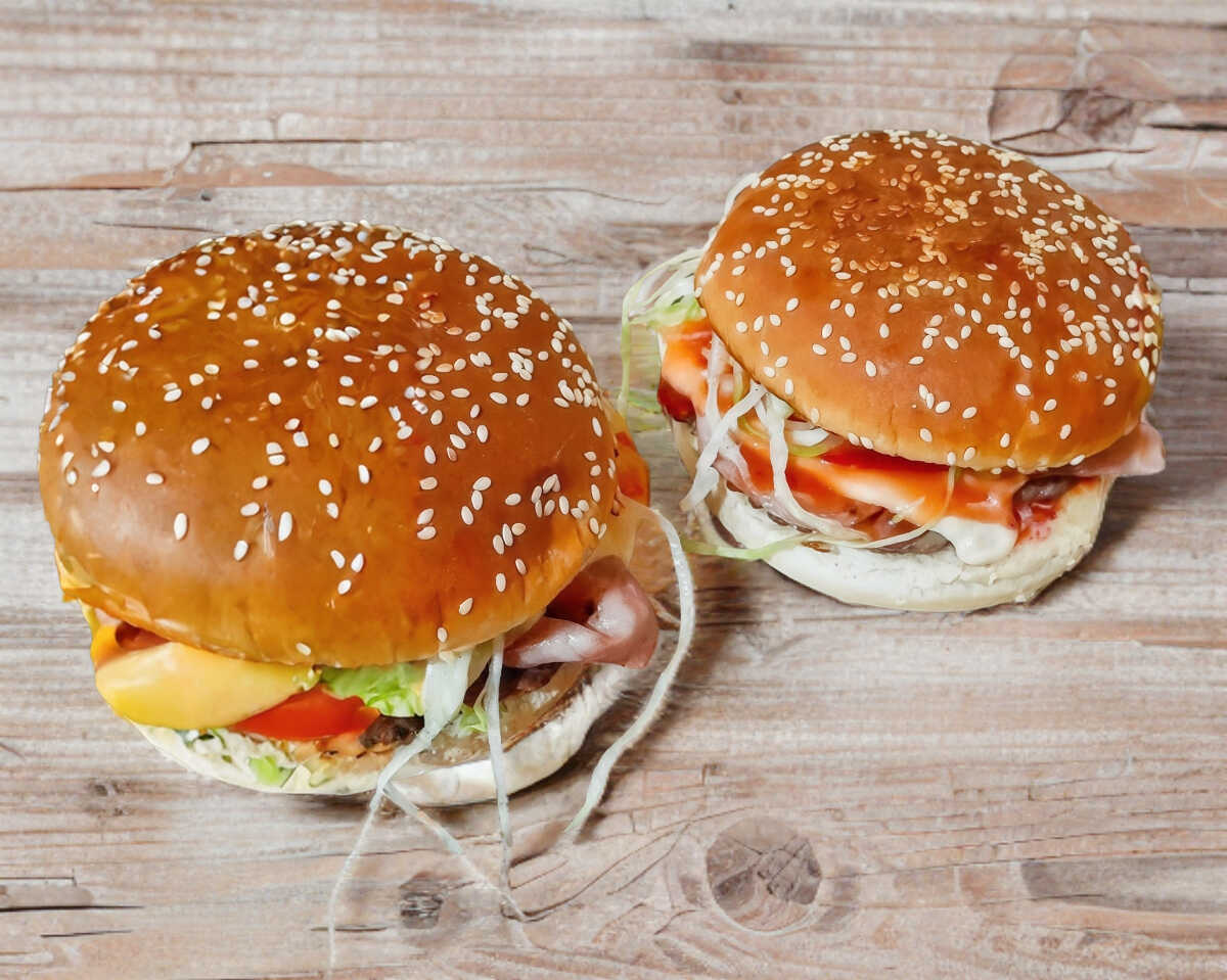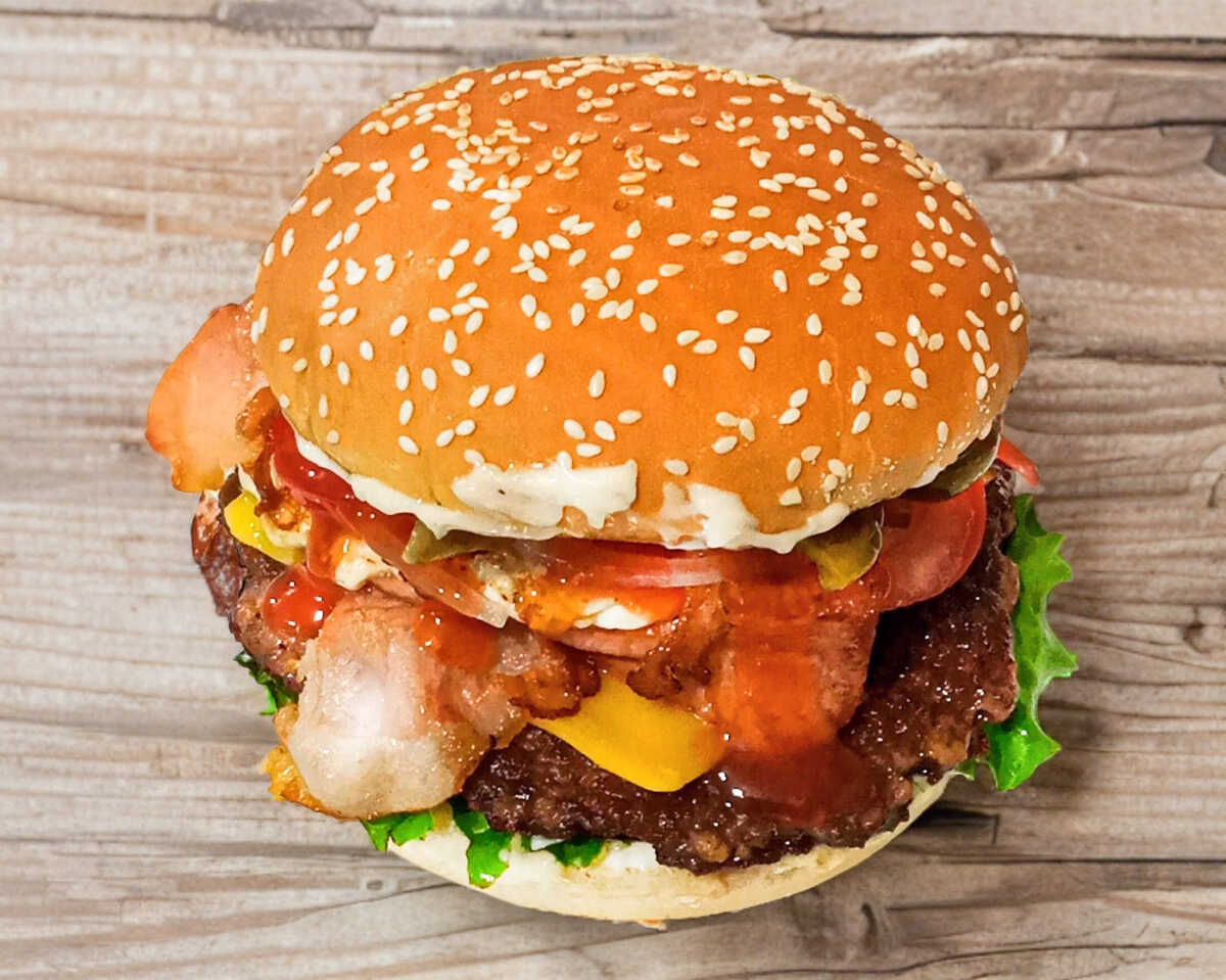 Bollo grande + Exquisita!! Carne de Res ( 2 Carnes ) + Tocino , Salchicha , Queso Amarillo y Quesillo.
