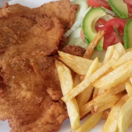 Exquisita!! Milanesa de Res con Ensalada de Lechuga + Papas Fritas , Tortillas de Maiz + Salsa Roja o Verde a elegir.