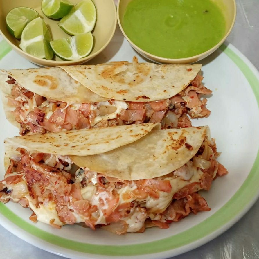 + de 500 g» de Sabor!! Preparación con Bistec de Cerdo + Jamón, Cebolla, Tocino, Quesillo, Adobo de chipotle + Tortillas de harina o Maíz a Tu Elección, Salsa Verde o Roja y Limones.