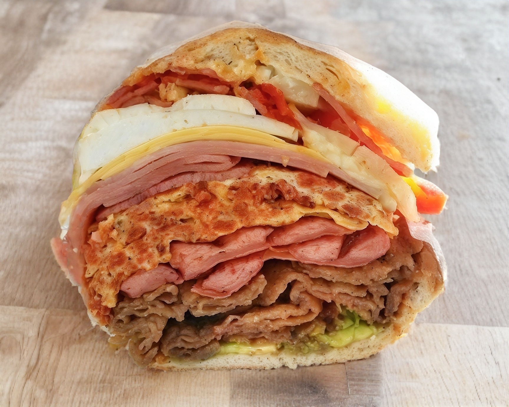 Bistec, tocino y quesillo (aguacate, jitomate, cebolla, mayonesa, chipotle rajas).