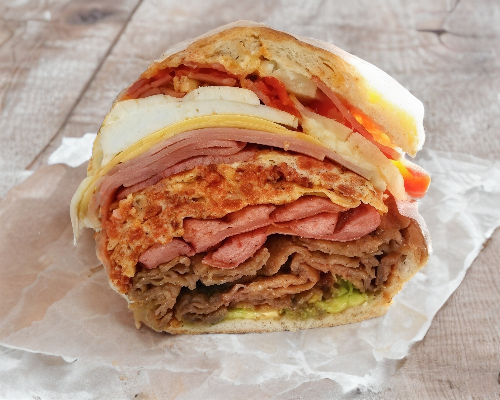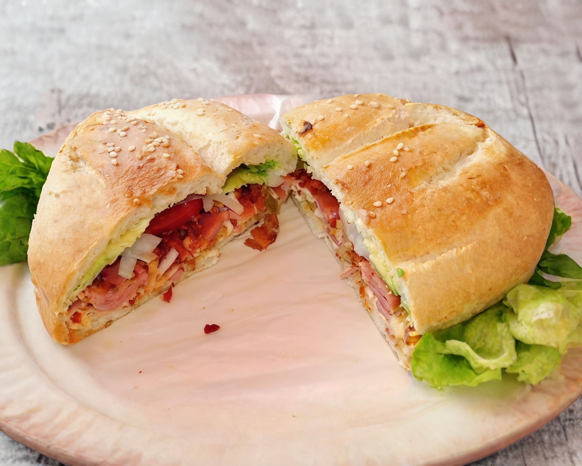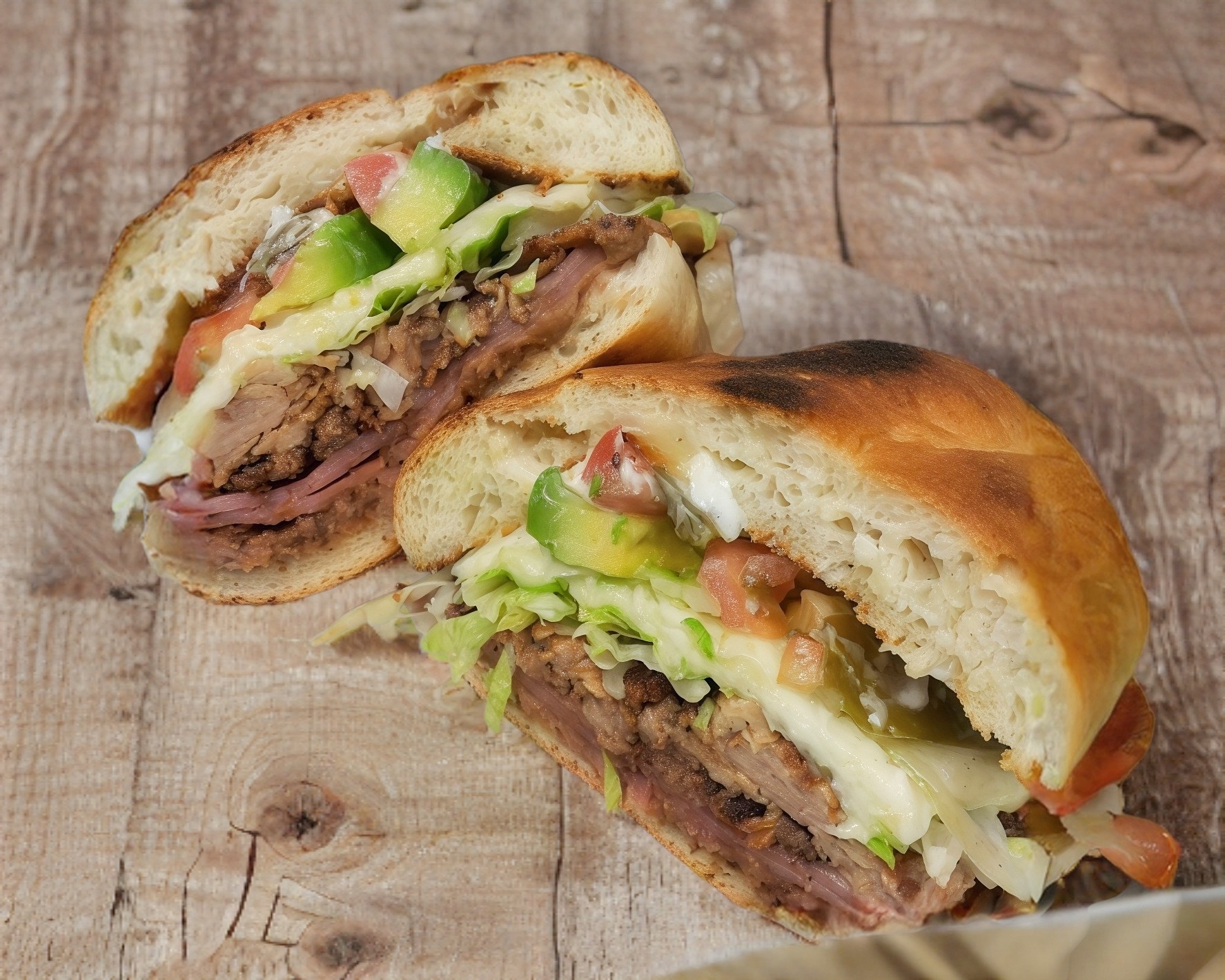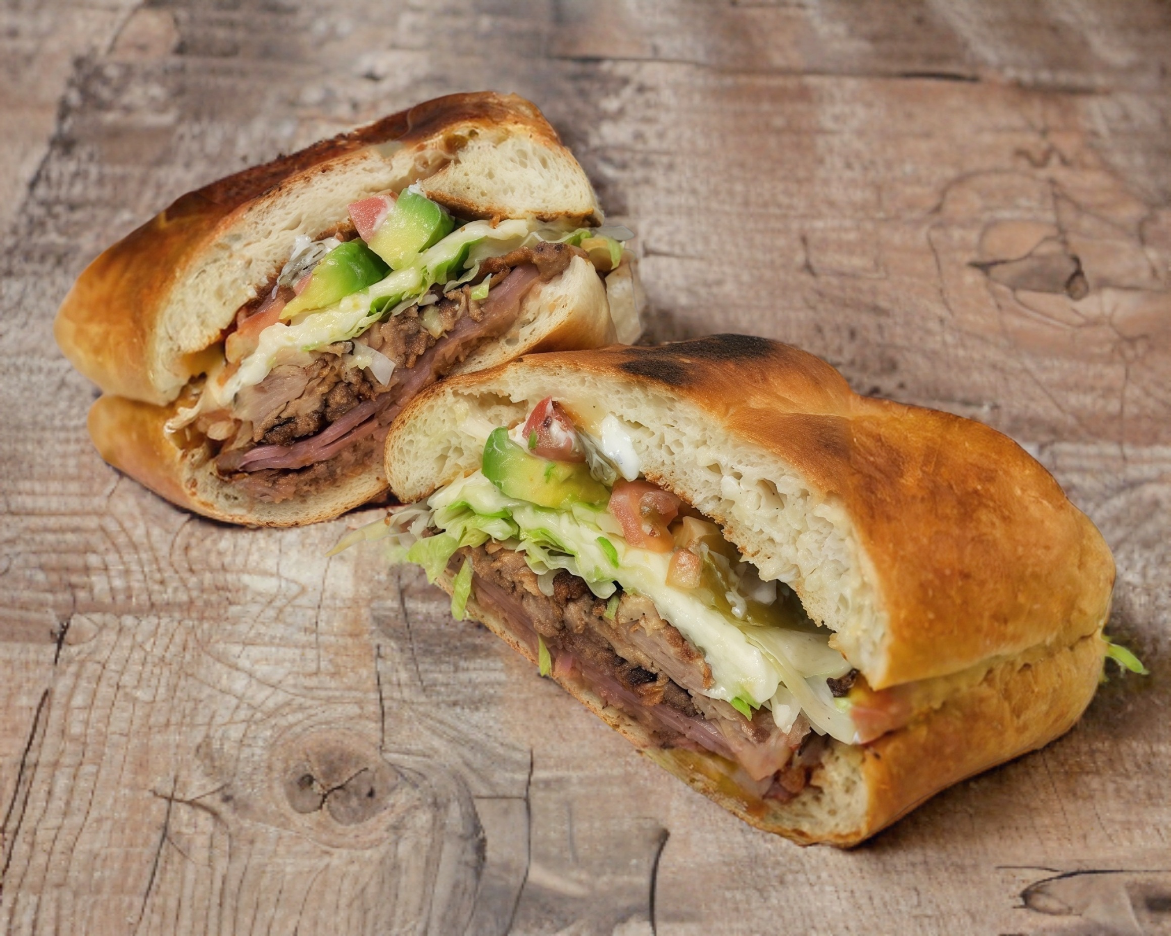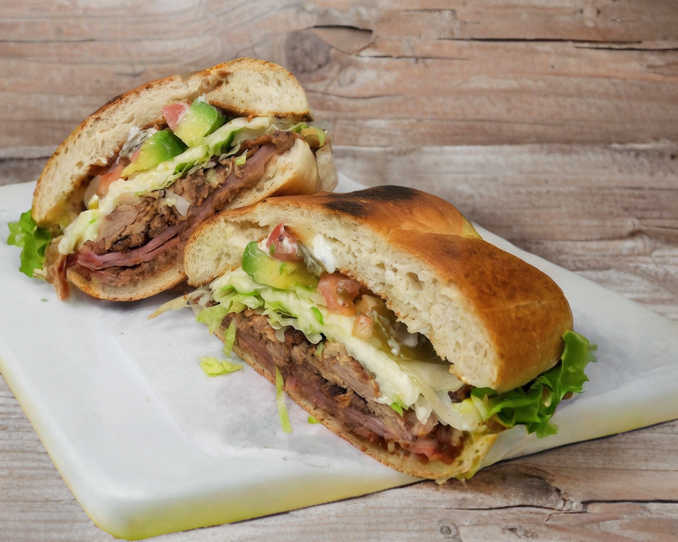 Bistec, pierna y quesillo (aguacate, jitomate, cebolla, mayonesa, chipotle rajas).