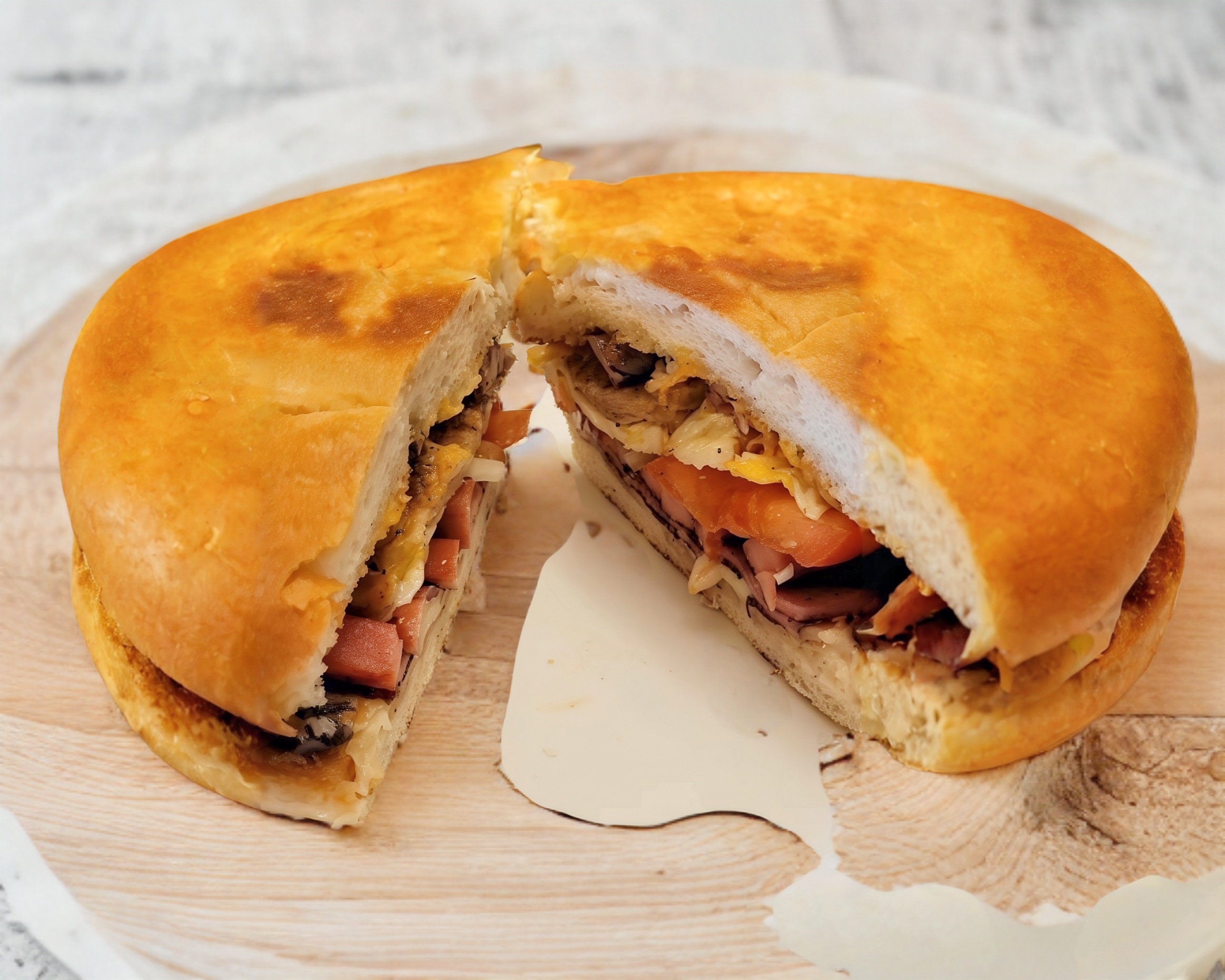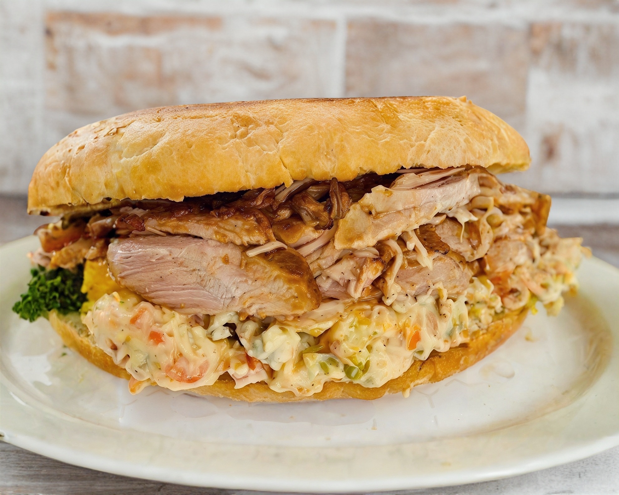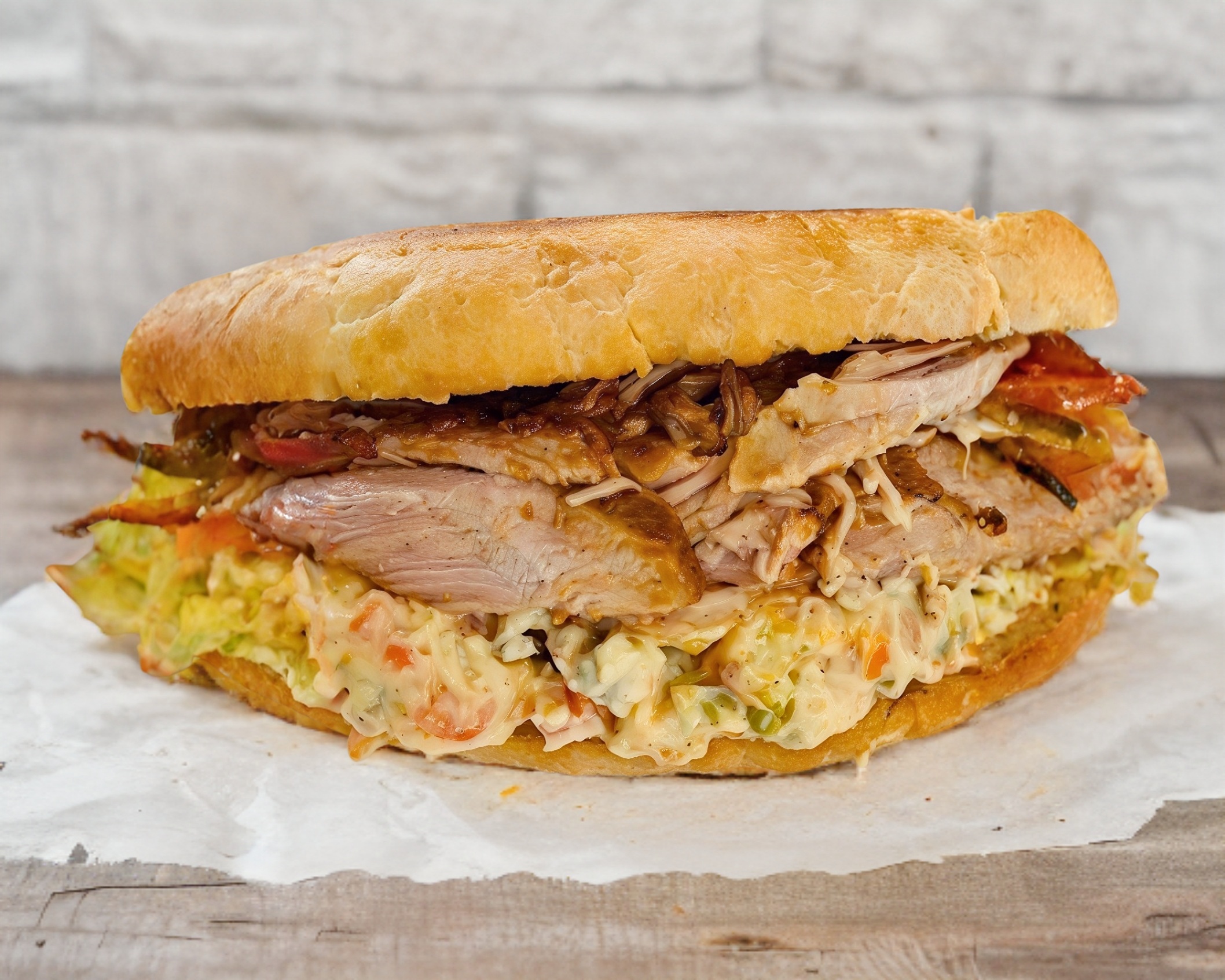 Chuleta, pierna y quesillo (aguacate, jitomate, cebolla, mayonesa, chipotle rajas).