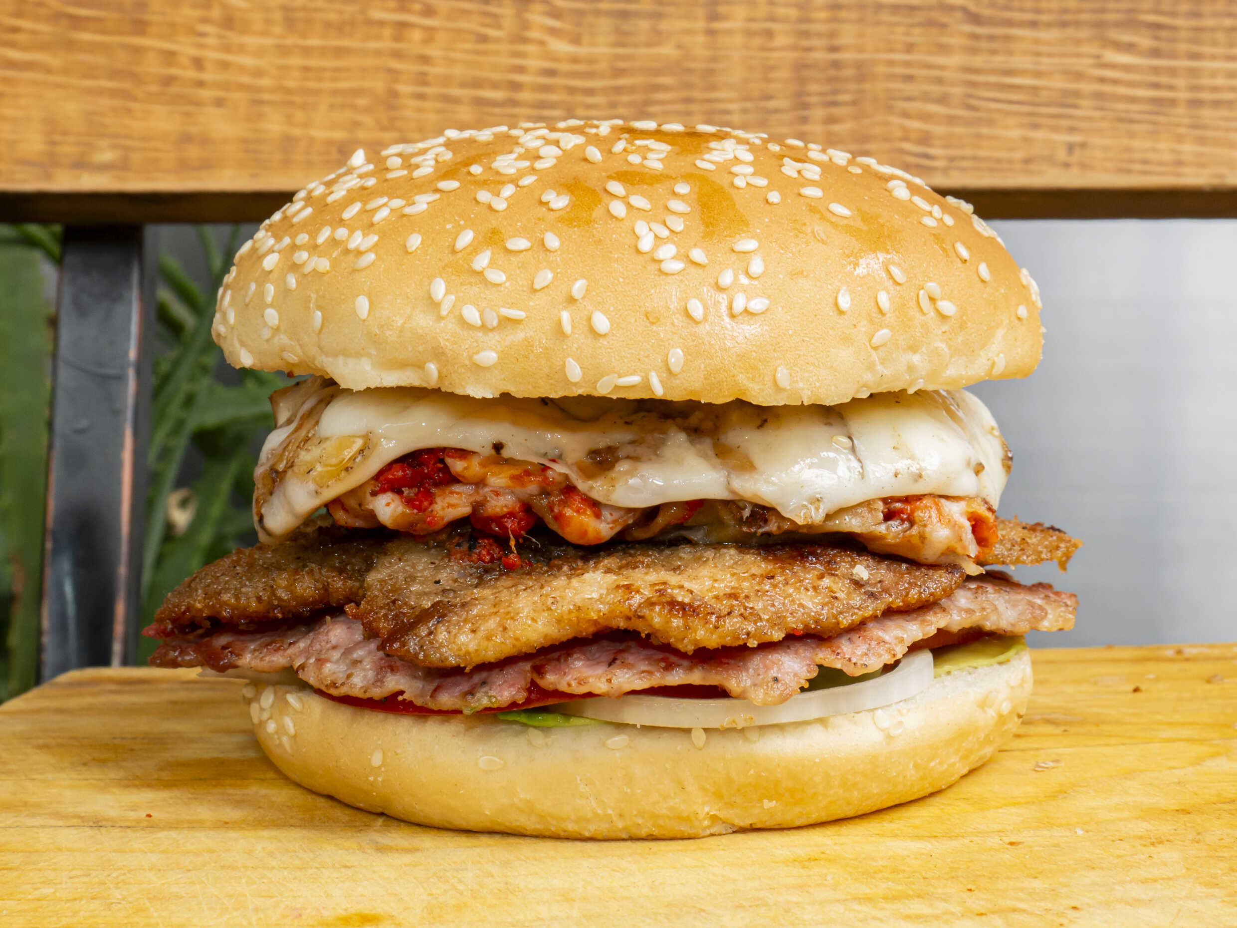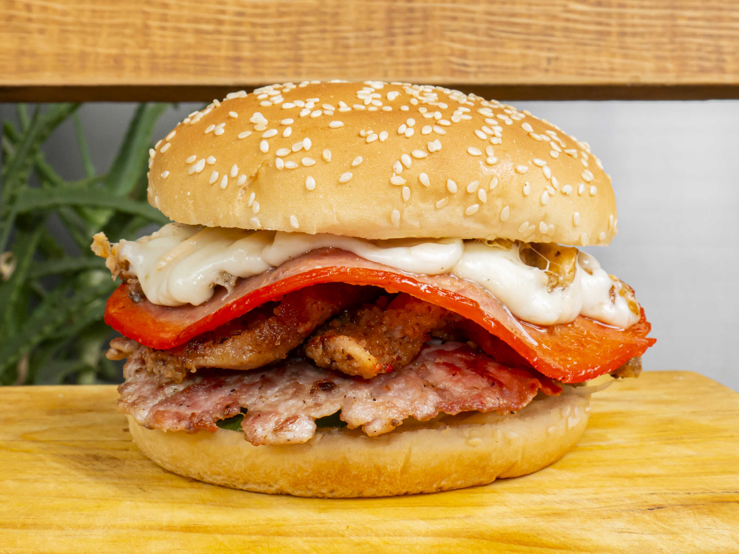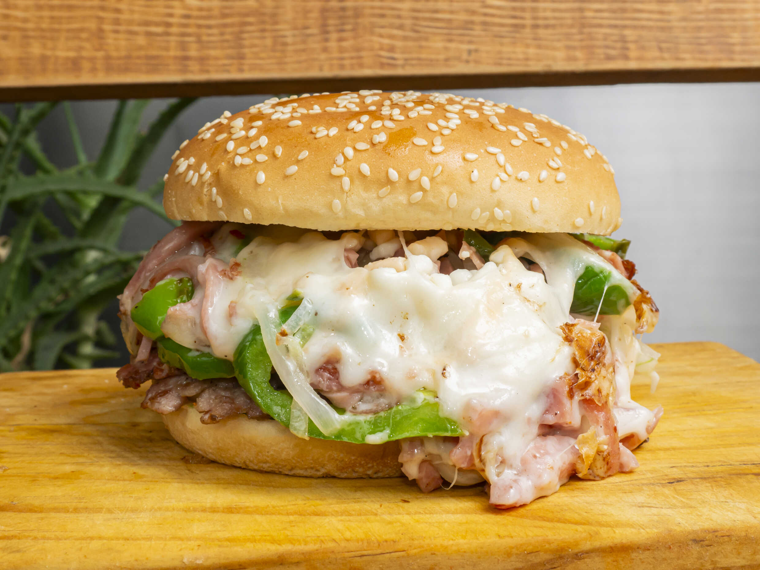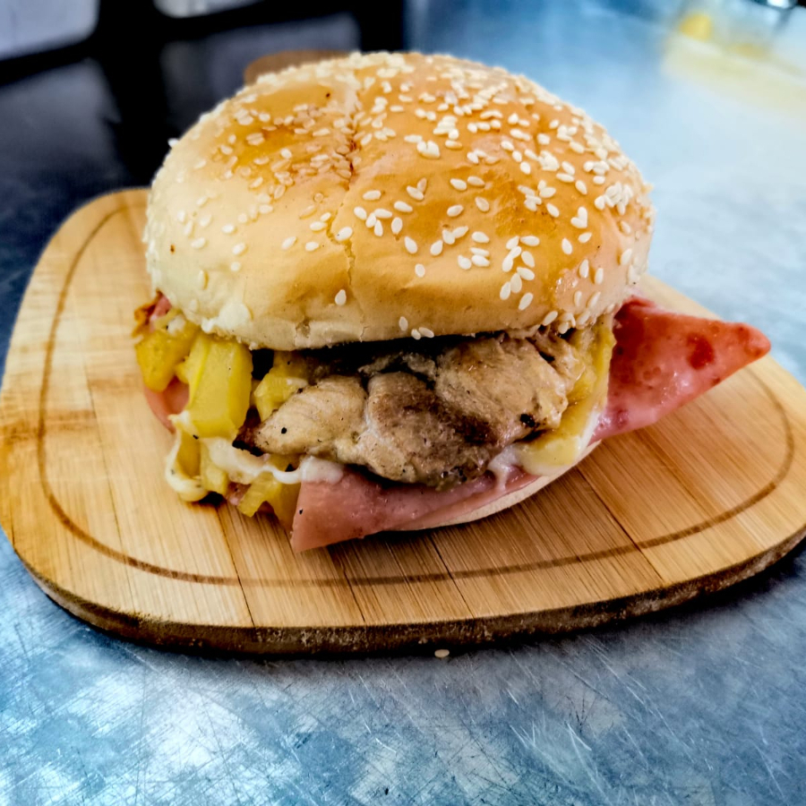 Carne de hamburguesa, Pollo, jamón,piña y quesillo.