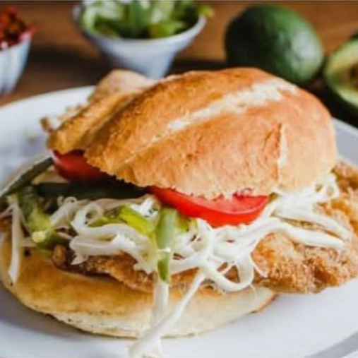 Pan chico, frijoles, mayonesa, milanesa de res, cebolla, jitomate, aguacate, chiles.