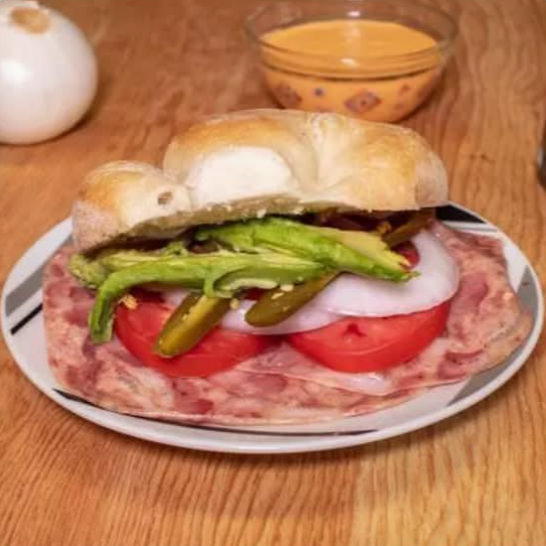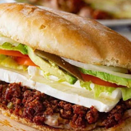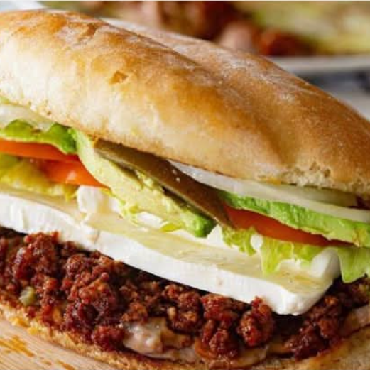 Pan telera gigante, frijoles chinos, mayonesa, queso de puerco, cebolla, jitomate, aguacate, chiles, lechuga, rajas o chipotle. La imagen es solo de referencia.