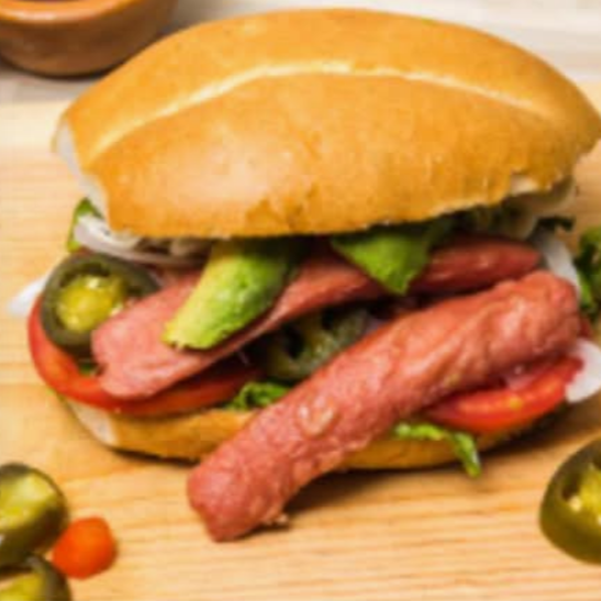 Pan telera gigante, frijoles chinos, mayonesa, salchicha, cebolla, jitomate, aguacate, chiles, lechuga, rajas o chipotle. La imagen es solo de referencia.