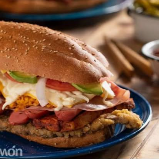 Pan telera gigante, frijoles chinos, mayonesa, huevo, cebolla, jitomate, aguacate, chiles, lechuga, rajas o chipotle. La imagen es solo de referencia.