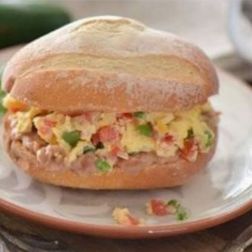 Pan chico, frijoles, mayonesa, chorizo de res, cebolla, jitomate, aguacate, chiles.