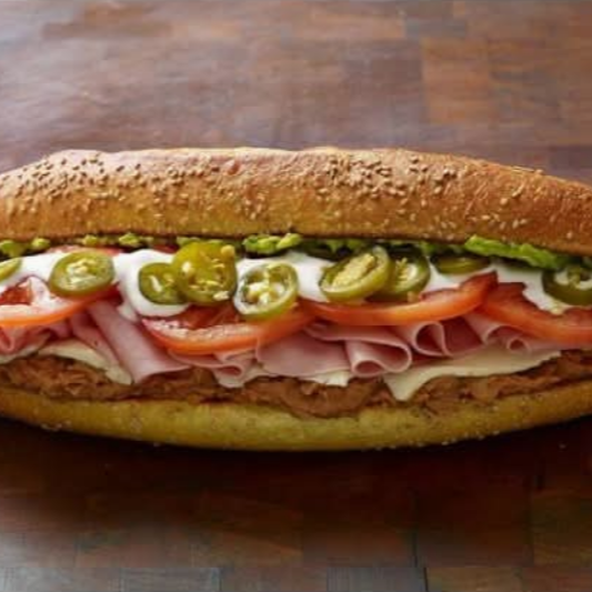 Pan gigante regular, frijoles chinos, mayonesa, jamón, cebolla, jitomate, aguacate, chiles, lechuga, rajas o chipotle. La imagen es solo de referencia.