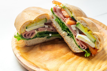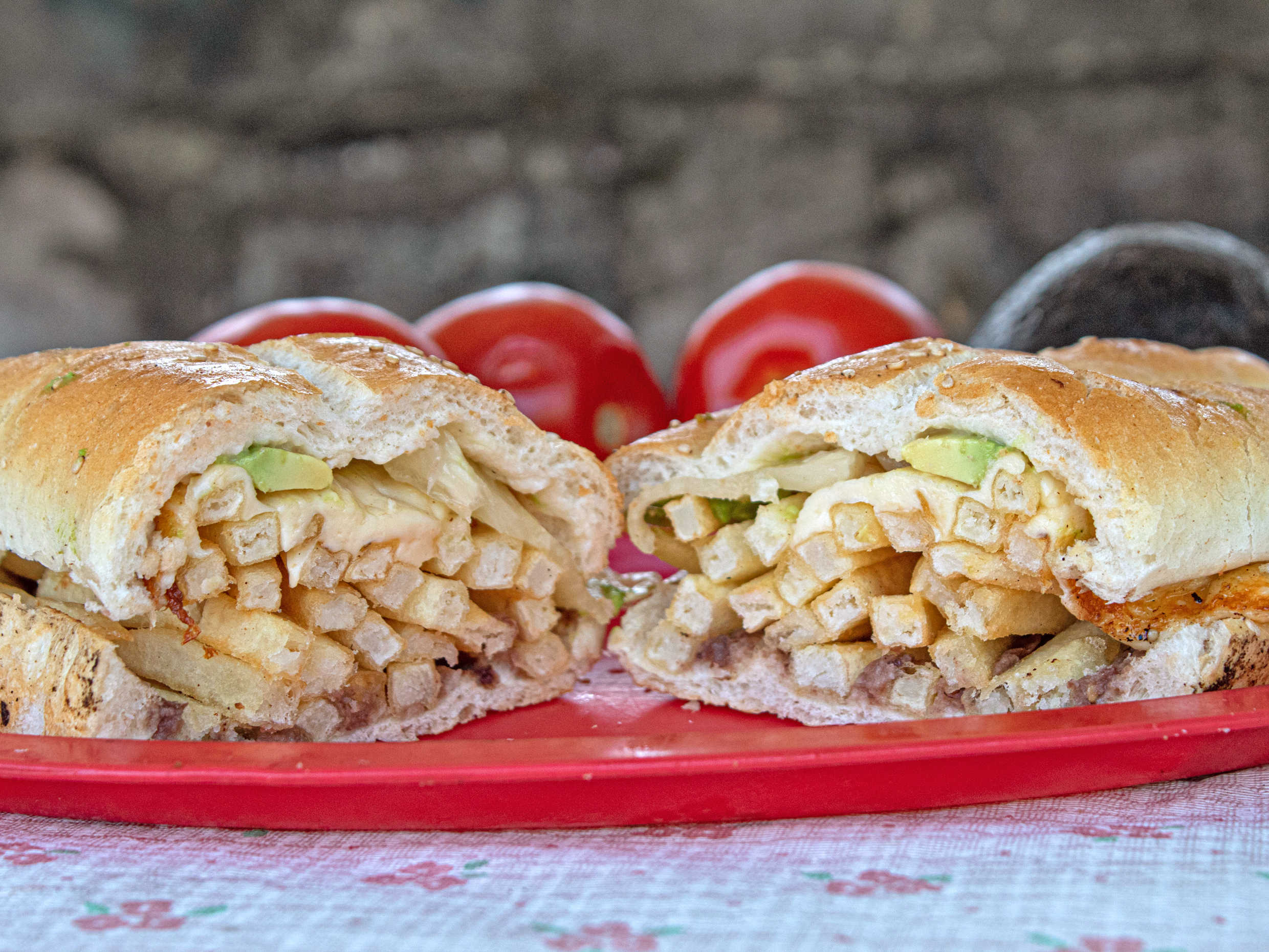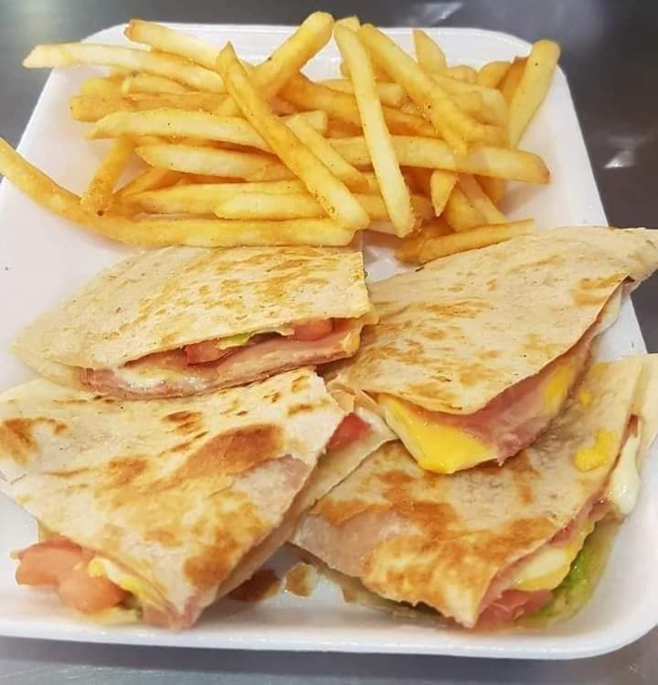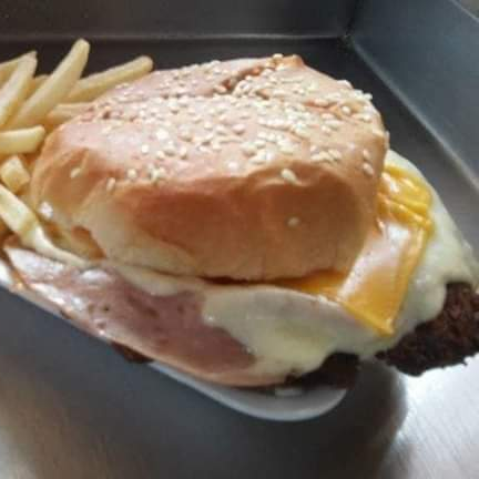 Carne, jamon, quesillo, queso amaricano y guarnición de papas a la francesa