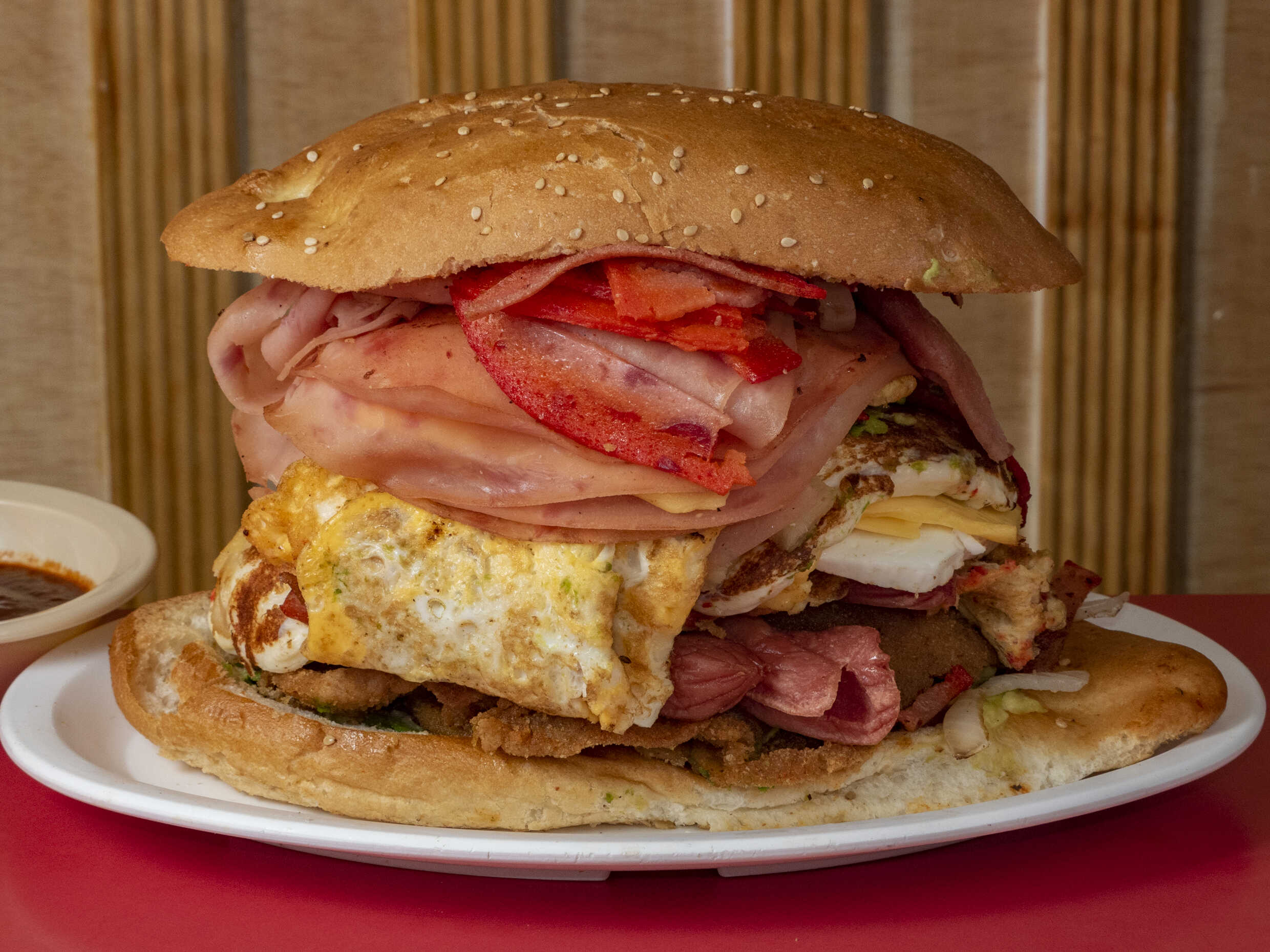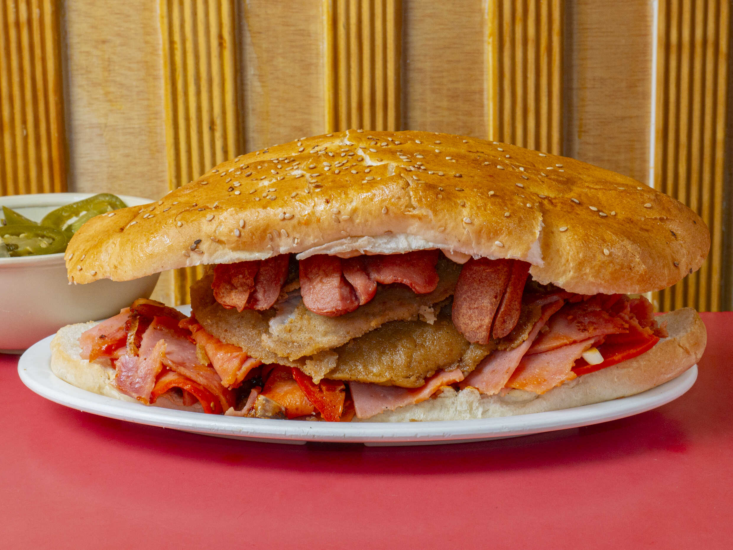 Milanesa, pierna, salchicha, jamón, huevo, chorizo, queso blanco y queso amarillo.
