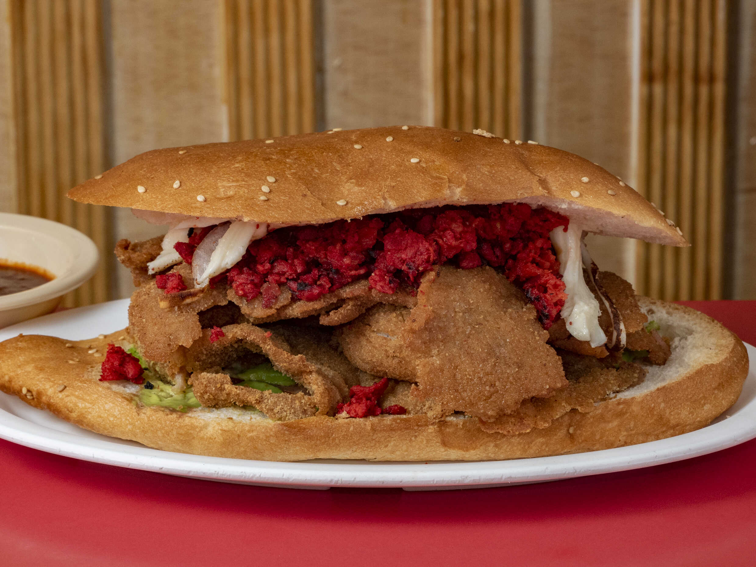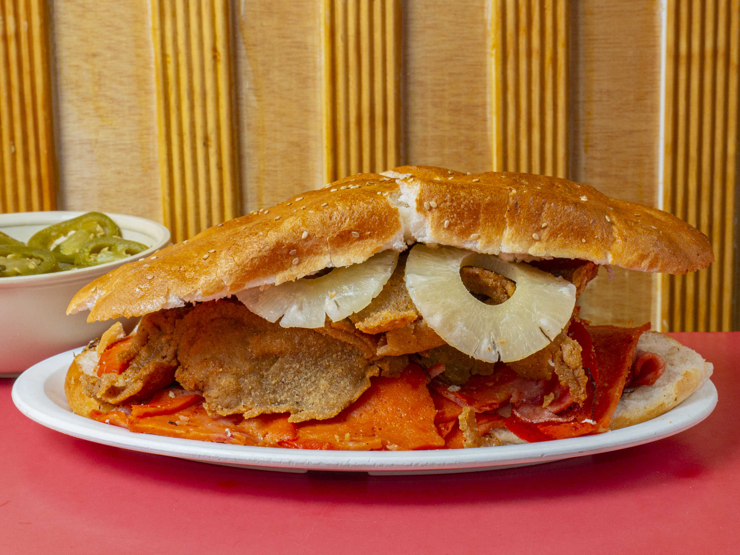 Milanesa, chorizo, piña y quesillo.