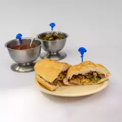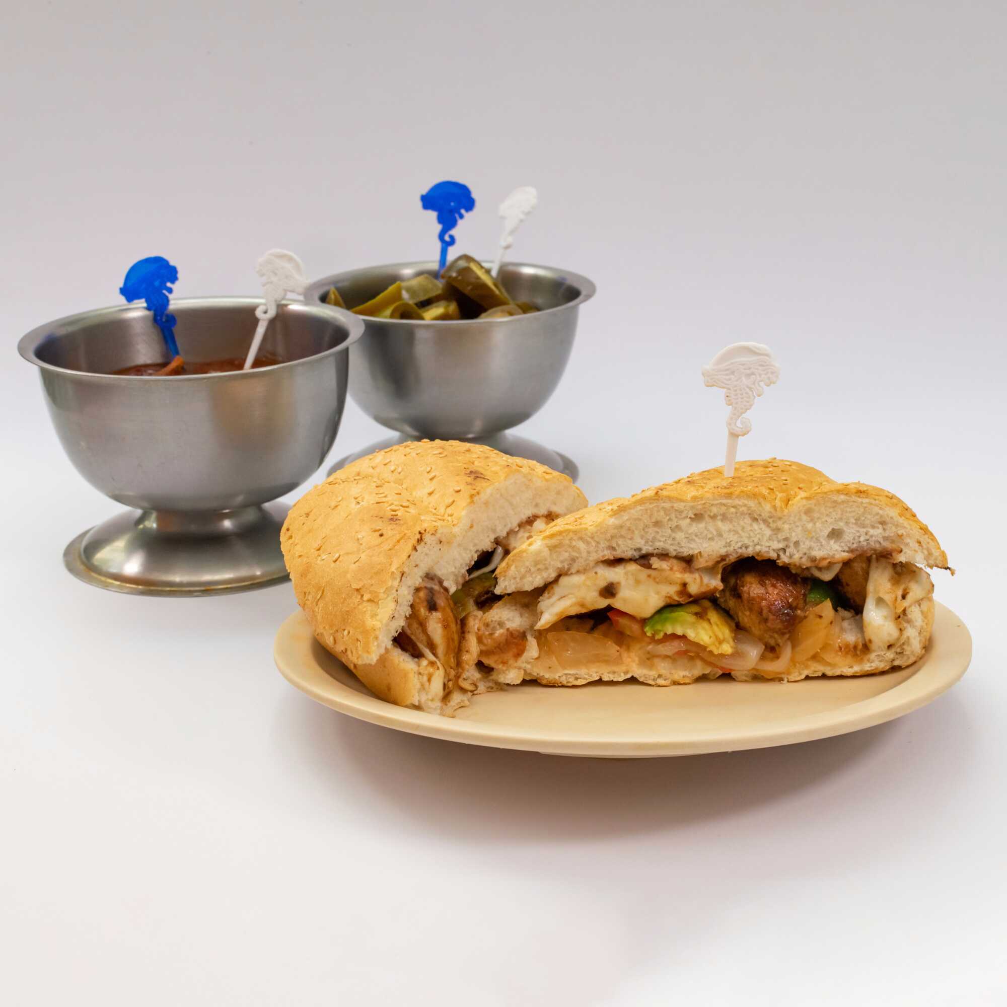 130g de Milanesa de Res, 60g de Chorizo, 60g de Queso Oaxaca. La torta lleva Frijoles refritos en la tapa y en la base tiene aguacate, jitomate y cebolla preparada. El chipotle o las rajas van aparte.