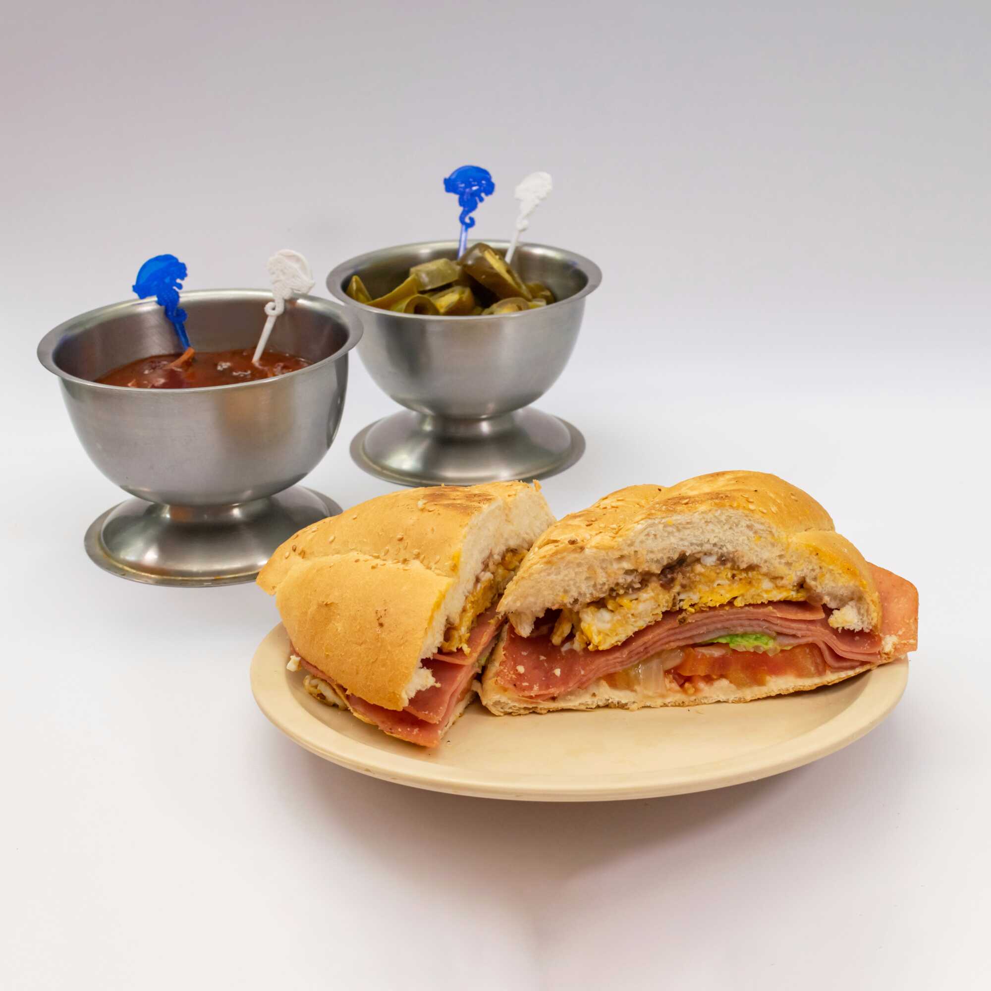 80g de jamón y 2 pza de Huevo revuelto. La torta lleva Frijoles refritos en la tapa y en la base tiene aguacate, jitomate y cebolla preparada. El chipotle o las rajas van aparte.