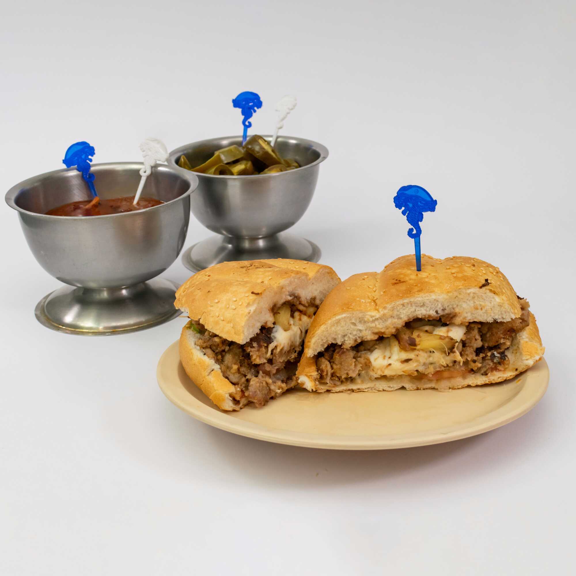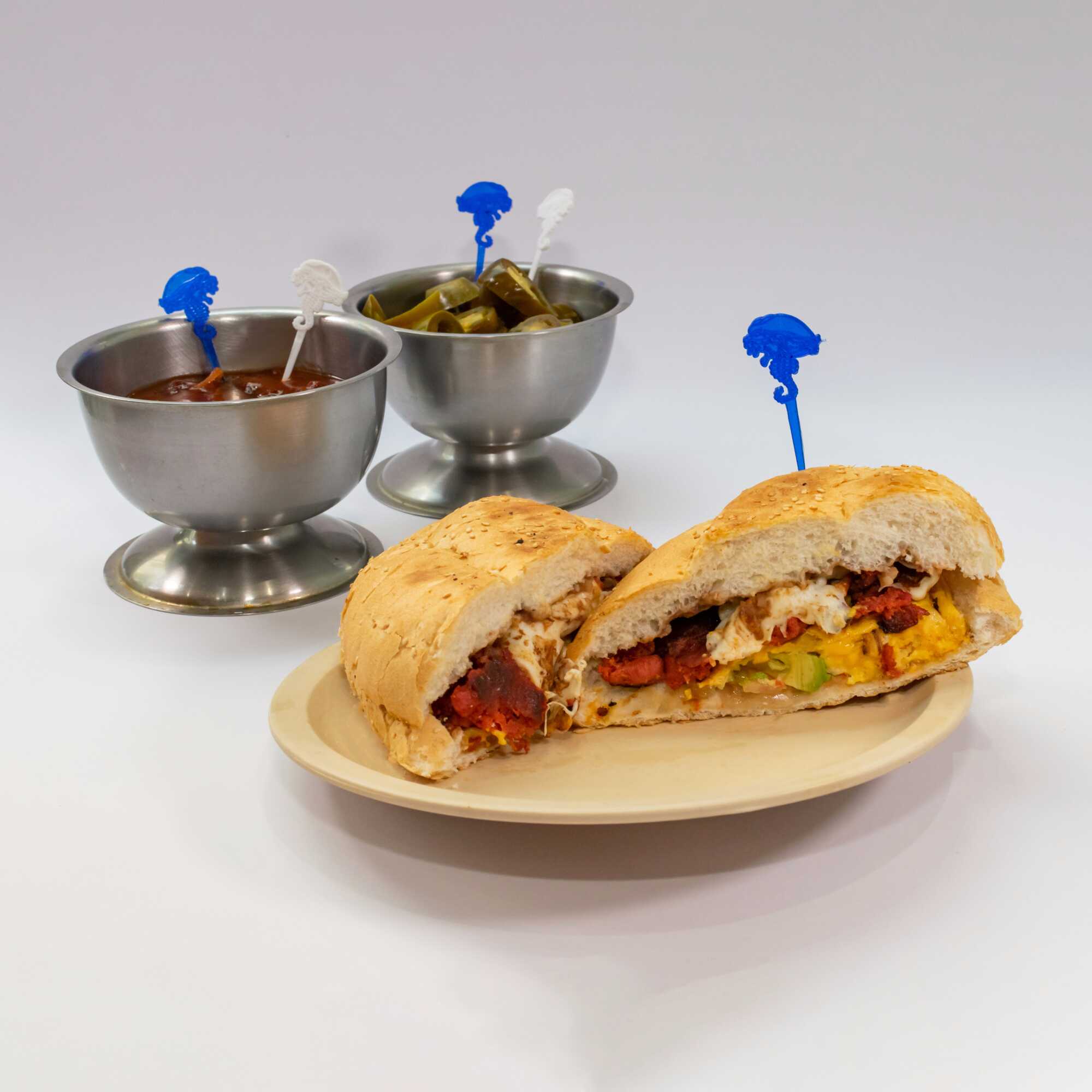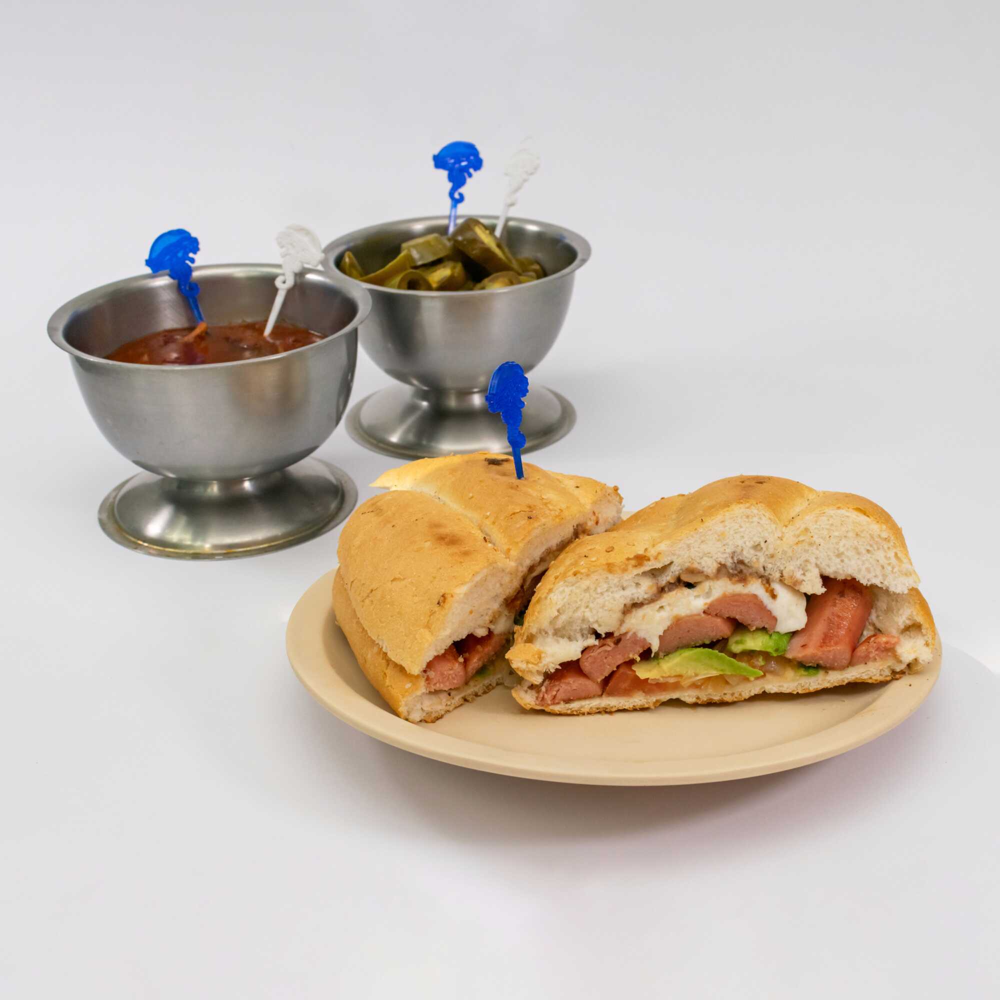 80g de salchicha y 60g de queso oaxaca. La torta lleva Frijoles refritos en la tapa y en la base tiene aguacate, jitomate y cebolla preparada. El chipotle o las rajas van aparte.