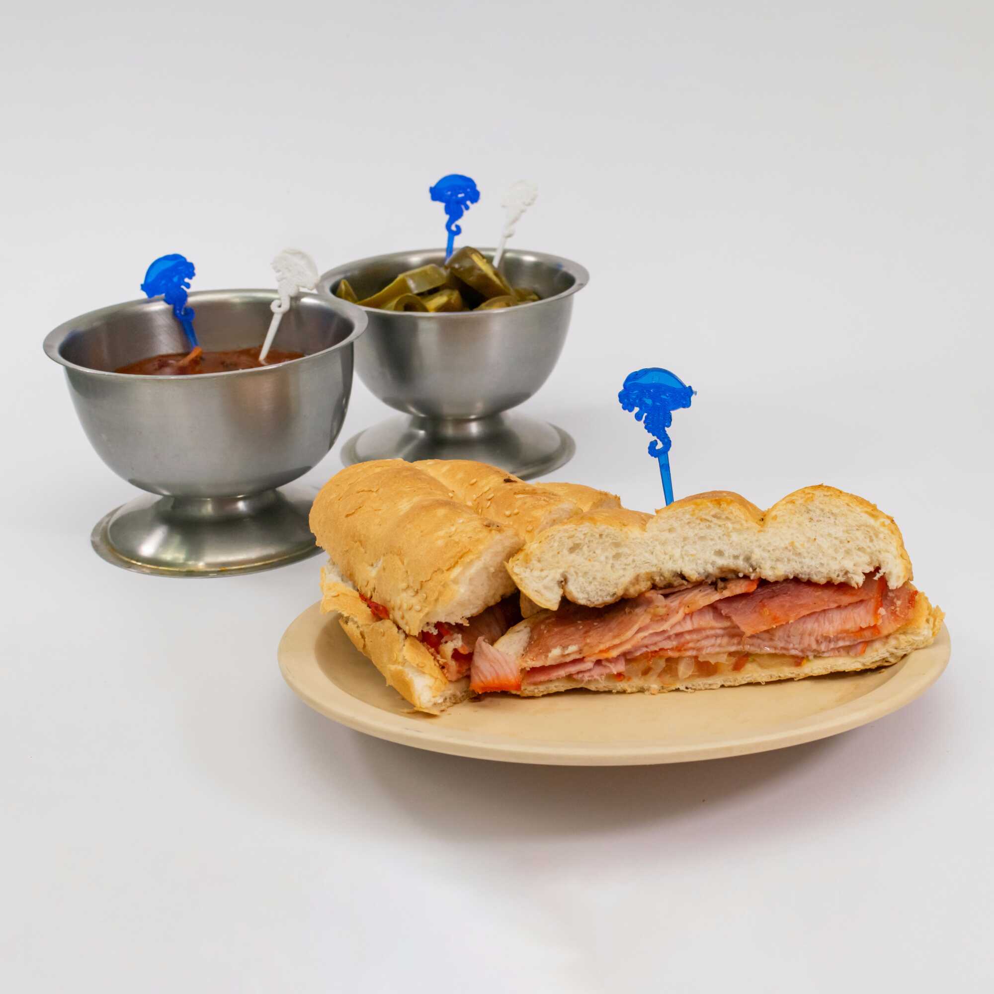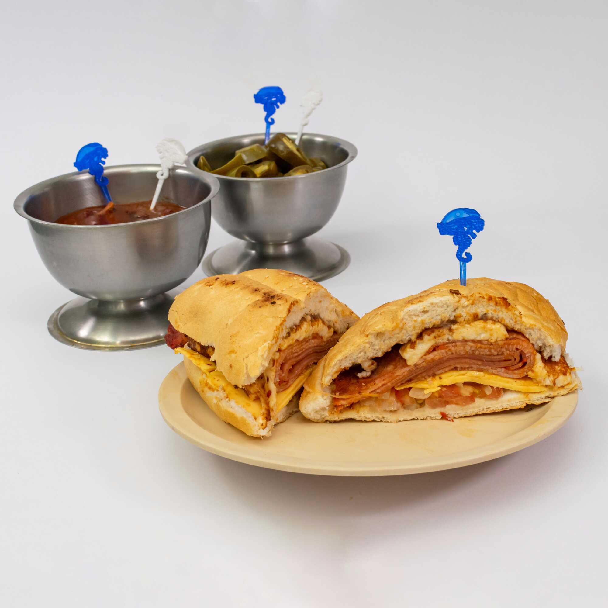 130g de pierna española, 40g de jamón, 60g de queso Chihuahua. La torta lleva Frijoles refritos en la tapa y en la base tiene aguacate, jitomate y cebolla preparada. El chipotle o las rajas van aparte.