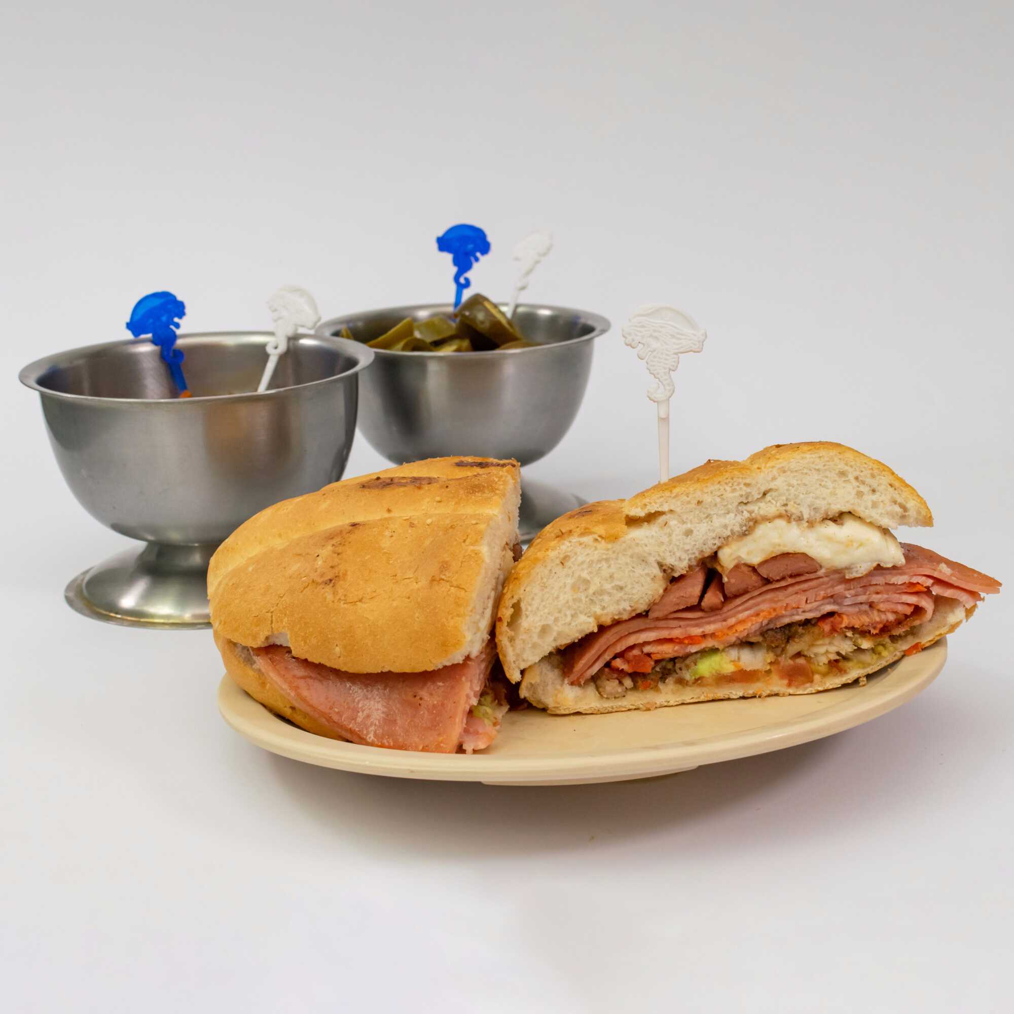 130g de Lomo Adobado, 40g de jamón, 60g de queso oaxaca, 40g de Queso Amarillo. La torta lleva Frijoles refritos en la tapa y en la base tiene aguacate, jitomate y cebolla preparada. El chipotle o las rajas van aparte.